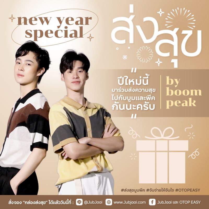 คู่จิ้นใจบุญ บูม-กฤตภัค อุดมพานิชและ พีค-ภีมพล พาณิชย์ธำรง ชวนเหล่าบรรดาแฟนๆ อุดหนุนสินค้า OTOP ช่วยเหลือผู้ประกอบการไทยทั่วประเทศ กับแคมเปญดีๆ ส่งท้ายปี “ส่งสุข Everyday Special”ที่ทาง บริษัทป.ปัน วิสาหกิจเพื่อสังคม จับมือกับ กรมการพัฒนาชุมชน จัดกิจกรรมทางการตลาดส่งเสริมรายได้ให้กับผู้ประกอบการไทยในช่วงเทศกาลปีใหม่ชวนคนไทยมาจับจ่ายสินค้าไทยคุณภาพดี คุ้มราคา บนแพลตฟอร์มออนไลน์ jubjaai.com