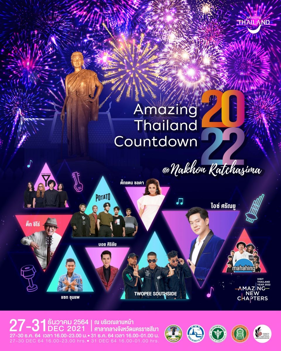 ททท.ร่วมกับจังหวัดนครราชสีมา ชวนเที่ยวงานเทศกาลส่งท้ายปีเก่า ต้อนรับปีใหม่ 2565 : Amazing Thailand Countdown 2022 - Amazing New Chapter @ Nakhon Ratchasima เพื่อประกาศว่า ปี 2565 นี้ อีสานพร้อมแล้วที่จะต้อนรับนักท่องเที่ยวจากทั่วทุกมุมโลก ภายใต้แนวคิด “SMILEY THAILAND” มนต์เสน่ห์แห่งแดนอีสานรอยยิ้มและสีสันแห่งความสนุก ณ ลานหน้าศาลากลางจังหวัดนครราชสีมา ระหว่างวันที่ 27 - 30 ธันวาคม 2564 เวลา 16:00 – 23:00 น. และวันที่ 31 ธันวาคม 2564 เวลา 16:00 – 01:00 น.