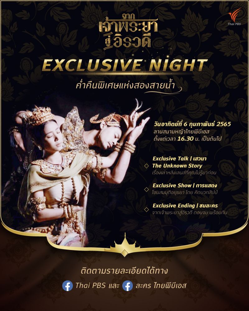 จนถึงโค้งสุดท้ายตอนจบ ตอนที่ 12 ในวันที่ 6 กุมภาพันธ์นี้ ทางไทยพีบีเอส จึงอยากจัดกิจกรรมพิเศษ เพื่อตอบแทนแฟนละครและผู้ชมที่ติดตามไทยพีบีเอส ที่ชื่นชอบและทำให้เกิดกระแสชื่นชมในละครเรื่องนี้ มาร่วมส่งท้ายละครอย่างพิเศษสุด กับ กิจกรรมสุดพิเศษ“จากเจ้าพระยาสู่อิรวดี Exclusive Night ค่ำคืนพิเศษแห่งสองสายน้ำ” ในวันอาทิตย์ ที่ 6 กุมภาพันธ์ 2565 นี้ ณ ลานสนามหญ้าไทยพีบีเอส ตั้งแต่ 16.30 เป็นต้นไป ความพิเศษสุดของงาน ที่ผู้ร่วมงานกิจกรรมจะได้ร่วมประสบการณ์ ไปด้วยกัน จะประกอบด้วย