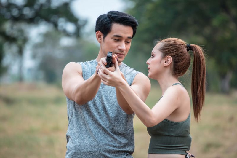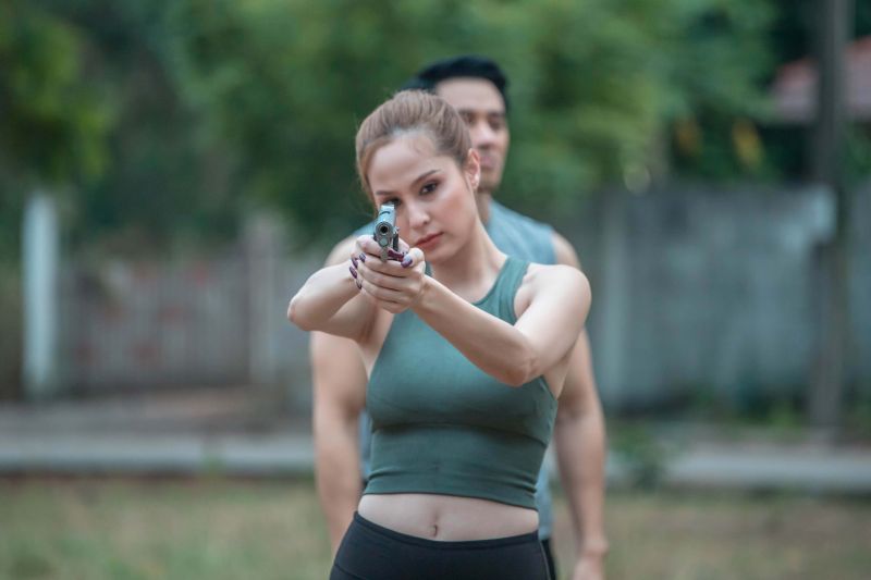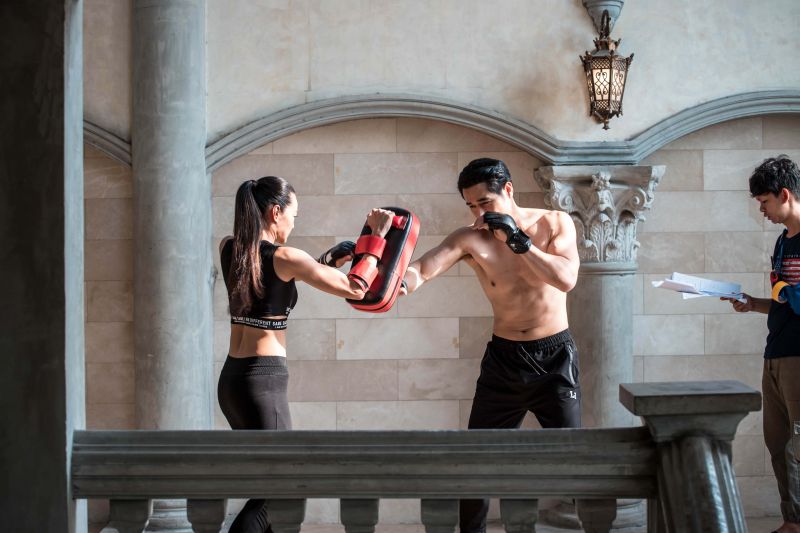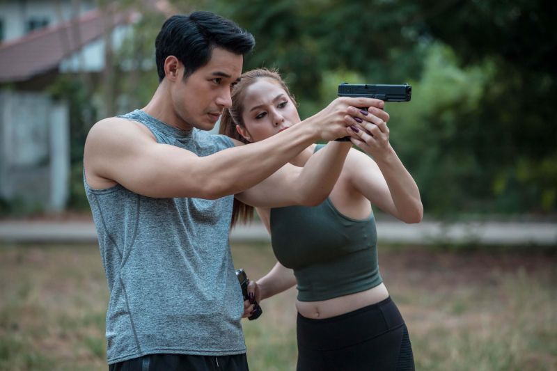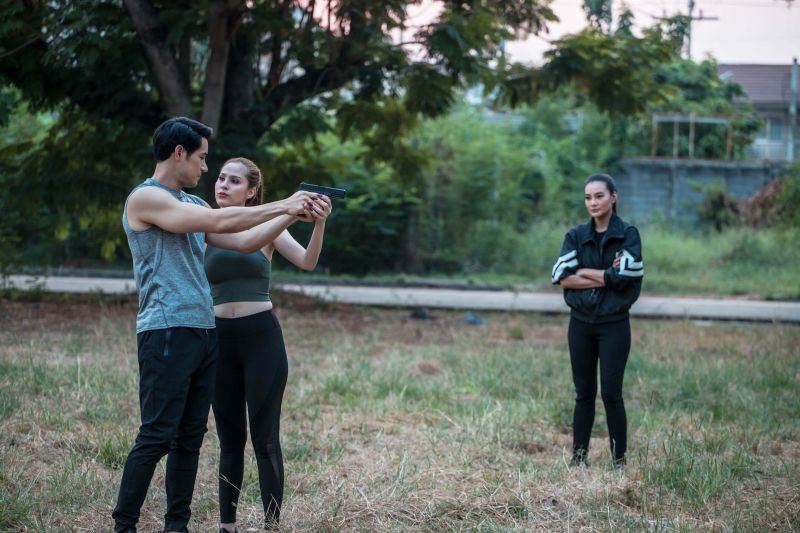 ไม่ว่าจะเป็นต่อยมวย ยิงปืน ทักษะการเอาตัวรอดเพื่อปฏิบัตภารกิจ ซึ่งก่อนถ่ายจริงหนุ่มโอมก็ขอเรียกความฟิตซิทอัพเรียกกล้ามเนื้อกันหน่อยเพราะฉากนี้จะต้องถอดเสื้ออวดร่องอก กล้ามท้อง กล้ามแขน ที่แฟนๆ เห็นแล้วต้องละทวยแน่นอน ฟากสองสาวก็ขอเรียกความฟิตยืดเส้นยืดสายคลายกล้ามเนื้อกันเช่นเดียวกัน พอนักแสดงทั้งสามพร้อม เริ่มถ่ายฉากโอมซ้อมต่อยมวยกับนุ้ยก่อน ทั้งคู่ก็ปล่อยมัดกันตามที่ซ้อมอย่างสนุกสนานให้ผู้กำกับเก็บรีแอ็คชั่นจนได้ภาพสวยงามสมใจ ก็ไปต่อที่ฉากขวัญต้องสอนยิงปืนให้กับโอม โดยเริ่มตั้งแต่ขวัญเข้าไปประชิดตัวโอม สอนวิธีจับมือ การกะระยะยิงยังให้เข้าเป้า แต่โอมก็ยังเกๆ กังๆ ขวัญจึงเข้าไปสอนโอมอย่างใกล้ชิดจนทำให้โอมใจสั่นหวั่นไหวไปกับเสน่ห์ของขวัญจนออกอาการเสียสมาธิ ขวัญเองก็ออกอาการเขิน เธอจึงรีบแก้เก้อด้วยการแกล้งดุโอมแล้วผลักโอมออกให้ฝึกยิงด้วยตัวเอง เล่นเอานุ้ยที่ยืนมองอยู่ห่างๆ อดอมยิ้มไม่ได้ไปกับความปากแข็งไม่ยอมรับฟังใจตัวเองของทั้งคู่