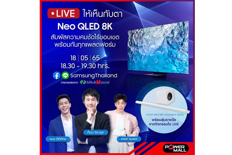 จัดใหญ่ จัดเต็ม ให้เห็นกับตา ซัมซุง ร่วมกับ POWER MALL เดอะมอลล์ กรุ๊ป ชวนสัมผัสความคมชัดไร้ขอบเขตของทีวี SAMSUNG NEO QLED 8K ในกิจกรรม “LIVE LIMITLESS WITH NEO QLED 8K” เปิดตัวไลน์อัพใหม่ล่าสุดของทีวี NEO QLED 8K แห่งปี 2022 พบกับครั้งแรกของสมาร์ททีวีที่รองรับแพลทฟอร์ม NFT พร้อมเจาะลึกสุดยอดเทคโนโลยีจอภาพ เสียง และอีกระดับของการเชื่อมต่อเพื่อประสบการณ์รับชมอันสมบูรณ์แบบ พร้อมชวนหนุ่มหล่อสไตล์อปป้าเกาหลี “ออฟ - จุมพล อดุลกิตติพร” ควงคู่พิธีกรหนุ่มมากความสามารถ “แบม - ปีติภัทร คูตระกูล” และท็อป - จิรายุส ทรัพย์ศรีโสภา CEO ของบริษัท Bitkub Capital Group Holdings Co., Ltd. มาร่วมพูดคุยช่วง TREND TALK- TREND VISION ในหัวข้อ “LIVE LIMITLESS WITH NEO QLED 8K” และสร้างสีสันตอกย้ำความยิ่งใหญ่ ในวันพุธที่ 18 พฤษภาคม 2565 เวลา 18.30-19.30 น. ไลฟ์ผ่านช่องทาง Facebook : Samsung Thailand และ Line Official Account : Samsung Thailand โดยถ่ายทอดสดจาก Bitkub M Social เอ็มควอเทียร์สำหรับลูกค้าทั่วไป พบประสบการณ์พิเศษสุดจาก SAMSUNG NEO QLED 8K ภายในงาน ระหว่างวันที่ 20-22 พฤษภาคม 2565 พร้อมรับข้อเสนอพิเศษสุดจากซัมซุง และ POWER MALL ได้ที่ Bitkub M Social เอ็มควอเทียร์