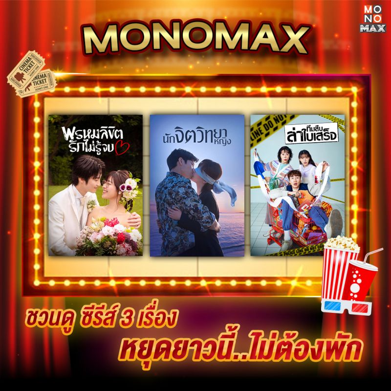 บอกเลยว่างานนี้!!! คนรักซีรีส์ห้ามพลาดกับ 3 เรื่องราวความรัก 3 สไตล์ รับชมได้ทาง MONOMAX (โมโนแมกซ์) กับโปรโมชันสุดคุ้ม แพ็กเกจ 3 เดือน ราคา 599 บาท โทรสอบถามรายละเอียด 02-100-7007