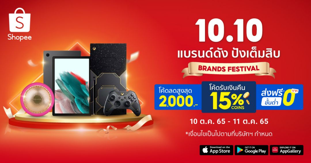 เก็บโค้ดเตรียมตัวช้อปในแคมเปญ Shopee 10.10 Brands Festivalนักช้อปจะได้เพลิดเพลินไปกับความคุ้มค่า อย่างโค้ดส่วนลด Shopee Mallลดสูงสุดถึง2,000บาท[1] โค้ดรับเงินคืนจัดหนักสูงถึง15%[2]พร้อมโค้ดส่งฟรี* ทั่วไทย[3] อัดแน่นดีลเด็ดจากแบรนด์ดังและร้านค้าชั้นนำบน Shopee Mall และ Shopee Premium อาทิ Unilever, Philips, Enfa, Verasu, Index Living Mall, Adidas, LG, Huawei และอีกมากมายในวันที่ 10 - 11 ตุลาคม 2565
