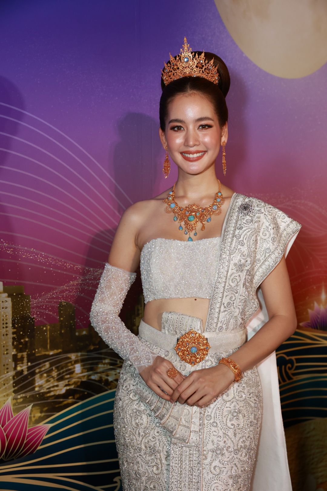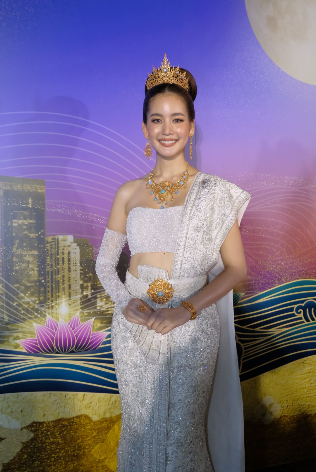 ในงานนี้นางเอกสาวหน้าหวานมากความสามารถ “โบว์ เมลดา” ได้แปลงโฉมเป็นนางนพมาศ ประจำปี 2565 ปรากฏกายด้วยชุดไทยจักรีประยุกต์ที่รังสรรค์ขึ้นมาเป็นพิเศษในชื่อชุด “นพนารีศรีชลมารค” ออกแบบโดย วนัช กูตูร์ซึ่งได้ออกแบบให้ชุดนางนพมาศปีนี้เป็นตัวแทนความงามของพระจันทร์วันเพ็ญที่งดงามโดดเด่นเป็นพิเศษในค่ำคืนวันลอยกระทง ผสานความเป็นไทยและตะวันออก ใช้ผ้าไหมไทยตัดเย็บทั้งชุด โทนสีขาวที่สื่อถึงแสงจากดวงจันทร์ในยามค่ำคืน ปักด้วยคริสตัลสะท้อนความระยิบ ระยับคล้ายดวงดาวส่องประกายยามต้องแสงจันทร์ โดยลายปักสื่อถึงความหมายของสายน้ำและจันทราในคืนพระจันทร์เต็มดวง พร้อมสวมพร้อมสวม ชุดเครื่องประดับทองคำล้ำค่าลวดลายโบราณชุด “โรหิณีจันทราพิมพาภรณ์” อันประกอบไปด้วย มงกุฎทองคำฝังเพชร, สร้อยคอทองคำฝังเพชร,