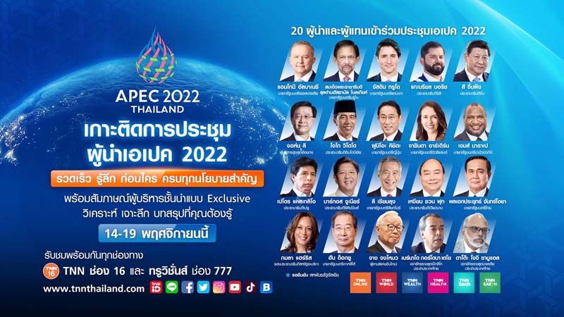 เศรษฐกิจเอเชีย-แปซิฟิก หรือ APEC 2022 เพื่อให้ประชาชนทุกคนตระหนักถึงความสำคัญ และโอกาสในการพลิกฟื้นเศรษฐกิจของประเทศไทยสำหรับการจัดงานครั้งนี้ TNN จัดทัพทีมข่าวมืออาชีพทั้งรายการข่าวเศรษฐกิจ และรายการต่างประเทศ รายงานทุกความเคลื่อนไหว ไขประเด็นเจาะลึกทุกมิติเศรษฐกิจโลกในทุกช่วงรายการ ส่องวิสัยทัศน์ เปิดมุมมองนักวิชาการ กูรูด้านการลงทุนนักธุรกิจระดับแนวหน้าของเมืองไทย ผลิตสกู๊ปรายงานพิเศษ “APEC Exclusive” ถ่ายทอดความเป็นมาและความร่วมมือทางเศรษฐกิจที่มีความสำคัญระดับโลก เกาะติดทุกสถานการณ์เอเปก2022 พร้อมบทสรุปทุกนโยบายสำคัญที่ควรรู้ ตั้งแต่วันที่ 14-19 พ.ย. 2565 ทาง TNN ช่อง 16 ทั้งรายการเศรษฐกิจ Insight, ย่อโลกเศรษฐกิจ, TNN Tech Reports, TNN Wold Today และ Business Watch ตลอดจนไลฟ์สดการประชุมสุดยอดผู้นำเอเปก ระหว่างวันที่ 17-18 พ.ย. 2565 ตั้งแต่เวลา 18.00-19.30 น. ช่องทางออนไลน์เฟซบุ๊ค TNN World และ Line TNN Online พร้อมอัปเดตข่าวสารผ่านทุกแพลตฟอร์ม TNN ทั้งหน้าจอ เว็บไซต์เฟซบุ๊ค ยูทูบ ไลน์ ทวิตเตอร์ อินสตาแกรม ติ๊กต็อก และบล็อกดิตรวมถึงสตรีมมิ่งผ่านแอปทรูไอดีตลอด 24 ชั่วโมง