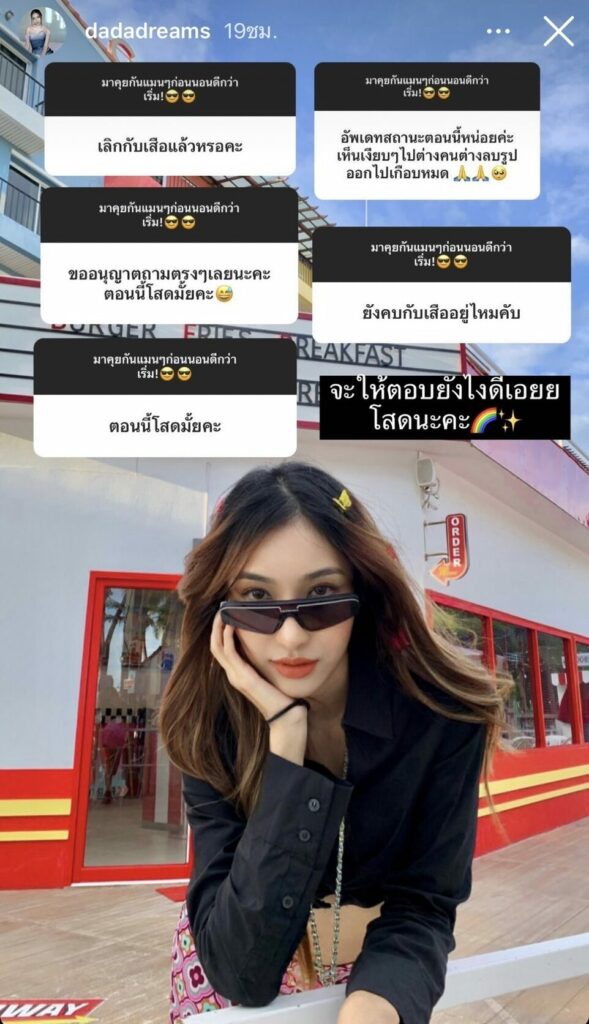 ล่าสุดฝ่ายหญิง ตอบกลับเรื่องของความรักในไอจีสตอรี่ ที่มีคำถามมากมาย เช่น เลิกกับเสือแล้วเหรอคะ, ตอนนี้โสดมั้ยคะ, ยังคบกับเสืออยู่ไหมคับ ซึ่ง สาวดรีม ตอบกลับอย่างชัดเจนว่า “จะให้ตอบยังไงดีเอยย โสดนะคะ”