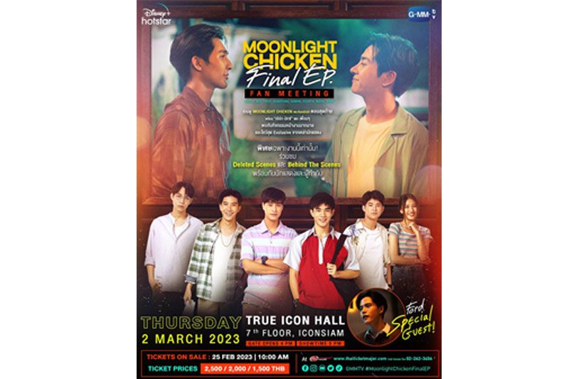 กระแสแรงไม่มีแผ่วและยังสร้างปรากฎการณ์ดังสนั่นโซเชียล ทะยานพุ่งติดเทรนด์“อันดับ 1”ทวิตเตอร์ในไทยและอีกหลายๆ ประเทศทั่วโลกในทุกEP ที่ออกอากาศ สำหรับซีรีส์คุณภาพสุดปัง“Moonlight Chickenพระจันทร์มันไก่”จาก “GMMTV”รวมทั้งเคมีเคใจของคู่จิ้นคู่ฮอต “เอิร์ท-พิรพัฒน์วัฒนเศรษสิริ” และ “มิกซ์-สหภาพ วงศ์ราษฎร์” กับบทบาทของ “ลุงจิม-เหวิน”ที่ทำเอาแฟนๆ อินเบอร์แรง ซึ่งล่าสุดเรื่องราวของข้าวมันไก่สุดกลมกล่อมจานนี้ได้เดินทางมาถึงตอนสุดท้ายแล้ว งานนี้“เอิร์ท-มิกซ์” พร้อมก๊วนเพื่อน“เฟิร์ส-คณพันธ์ ปุ้ยตระกูล, ข้าวตัง-ธนวัฒน์ รัตนกิจไพศาล, เจมีไนน์-นรวิชญ์ ฐิติเจริญรักษ์, โฟร์ท-ณัฐวรรธน์ จิโรชน์ธิกุล, มาร์ค-ภาคิน คุณาอนุวิทย์, วิว-เบญญาภา จีนประสม”และผู้กำกับฯ คนเก่ง “ออฟ-นพณัช ชัยวิมล”แท็กทีมมาชวนดูและลุ้นบทสรุปของทุกตัวแสดงไปพร้อมกันกับงาน“Moonlight Chicken Final EP. Fan Meeting”ในวันพฤหัสบดีที่ 2 มีนาคมนี้ ตั้งแต่เวลา 13.00 น. เป็นต้นไป ณ TRUE ICON HALL ชั้น 7 ไอคอนสยาม พร้อมด้วยสเปเชียลเกรซ“ฟอร์ด-อรัญญ์ อัศวสืบสกุล”ที่จะมาเสิร์ฟความสุขให้อย่างเต็มอิ่มตลอดทั้งงาน นอกจากนี้ยังมีกิจกรรมหน้างานอีกมากมาย รวมทั้งโชว์สุด Exclusive จากเหล่านักแสดง และพิเศษเฉพาะงานนี้เท่านั้น ที่จะได้ชม Deleted Scenes และ Behind The Scenesพร้อมกับนักแสดงและผู้กำกับฯ อีกด้วยการันตีทุกโมเมนต์ดีต่อใจฟูลฟิลขั้นสุดแน่นอน