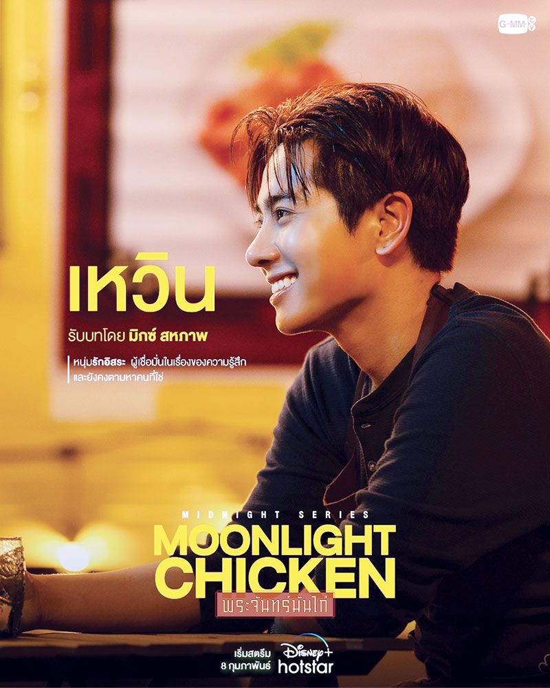 “ในซีรี่ส์เรื่องนี้ตัวแสดง “เหวิน” เป็นนักตกแต่งดิสเพลย์ ที่มีวันไนท์สแตนด์กับ “ลุงจิม” (รับบทโดย เอิร์ท-พิรพัฒน์) ซึ่งเขาเป็นคนที่ตามหาความรักจริงๆ อยากเจอรักแท้เหมือนเป็นบ้าน ฉะนั้น “ลุงจิม” นี่แหละคือสเปกจนทำให้เขาสปาร์คโดยคาแร็กเตอร์ “เหวิน” ผมใช้ตัวเองมาเล่นเลย เป็นผมเวอร์ชั่นคลั่งรักก็ว่าได้ครับ (หัวเราะ) และเป็นการรื้อฟื้นความรู้สึกเก่าๆ ของตัวเองเยอะมาก ทั้งความคิด ความอ่านรวมถึงเอาความรู้สึกทั้งหมดของผมที่เคยผ่านมาในชีวิตมาเล่นเป็นตัวแสดงนี้ เรียกได้ว่าเป็นเหมือนตัวผมเกือบ 100% เลยครับ ทำให้ผมอินกับบท “เหวิน” มากๆ และทุกครั้งที่ไปเวิร์กช็อปกลับบ้านไปผมก็จะร้องไห้ติดกันเป็นอาทิตย์เลย เพราะด้วยความอินกับบทที่คล้ายตัวเอง และอีกหนึ่งความยากของการเล่นเรื่องนี้ก็คือเล่นคู่กับ “พี่เอิร์ท” ยังไงก็ได้ให้ Freshy ให้ใหม่ทุกครั้งที่มาเจอกันเพราะเรื่องนี้เราเล่นด้วยกันเป็นเรื่องที่สามแล้ว ทำให้เรารู้ทันกัน เดาทางกันออกว่าจะเล่นยังไง ดังนั้นผมเลยต้องลบทุกอย่างออกหมด แล้วเป็นตัวแสดงนั้นให้ได้มากที่สุด รวมถึงคนอื่นๆ ในเรื่องด้วยอย่าง “เฟิร์ส-คณพันธ์,ข้าวตัง-ธนวัฒน์, เจมีไนน์-นรวิชญ์, โฟร์ท-ณัฐวรรธน์ ฯลฯ”ก็มีการค่อยๆ ปรับจูนกันไปซึ่งผมก็อยากให้ทุกคนติดตามชมซีรี่ส์เรื่องนี้กับอีกหนึ่งบทบาทที่ผมตั้งใจมากๆ เพราะว่าทุกครั้งที่เริ่มงานใหม่เหมือนเป็นการสร้างแรงบันดาลใจใหม่อีกครั้งหนึ่งในการทำงานของผม เรื่องนี้ก็เช่นกัน ฝากเป็นกำลังใจให้ผมและนักแสดงทุกคนด้วยนะครับ” ติดตามชม“Moonlight Chicken พระจันทร์มันไก่” สตรีมที่เดียวบน“Disney+ Hotstar” ทุกวันพุธ และ พฤหัสฯ เวลา 18.00 น.โดยสามารถดาวน์โหลดแอปพลิเคชั่น Disney+ Hotstar และสมัครสมาชิกผ่าน App Store หรือ Google Play หรือรับชมผ่านเว็บไซต์ www.disneyplushotstar.com และอัพเดททุกความเคลื่อนไหวได้ที่ www.facebook.com/gmmtvofficial & IG & YouTube & Twitter : GMMTV