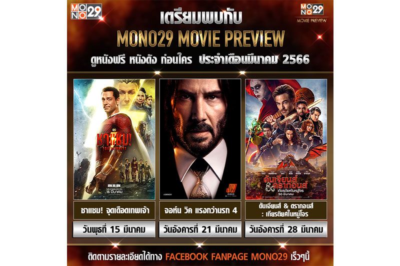 ตอกย้ำความเป็นทีวีที่มีหนังดีซีรีส์ดังมากที่สุด สำหรับช่องMONO29 ล่าสุดกลับมาจัดกิจกรรมให้คอหนังฟินอีกครั้งใน “MONO29Movie Preview ดูหนังฟรี หนังดังก่อนใคร”จัดเต็ม 3 ภาพยนตร์แอ็คชั่นสุดมันประจำเดือนมีนาคมให้ได้ชมก่อนใครได้แก่ ชาแซม! จุดเดือดเทพเจ้า (Shazam! Fury of the Gods) ,จอห์น วิค แรงกว่านรก 4 (John Wick: Chapter 4)และดันเจียนส์ &ดรากอนส์ : เกียรติยศใน (Dungeons & Dragons: Honor Among Thieves) ซึ่งมีกติกาง่าย ๆ เพียงติดตามเฟสบุ๊คเพจMONO29และเตรียมตัวลงทะเบียนลงชื่อรับบัตร ภายในวันและเวลาที่แอดมินกำหนด (1 สิทธิ์ ต่อ 2 ที่นั่ง)เพียงเท่านี้ก็มีสิทธิลุ้นรับตั๋วชมภาพยนตร์ก่อนใครไปแบบฟรี ๆ ณ โรงภาพยนตร์เมเจอร์ซีนีเพล็กซ์ สุขุมวิทเท่านั้น
