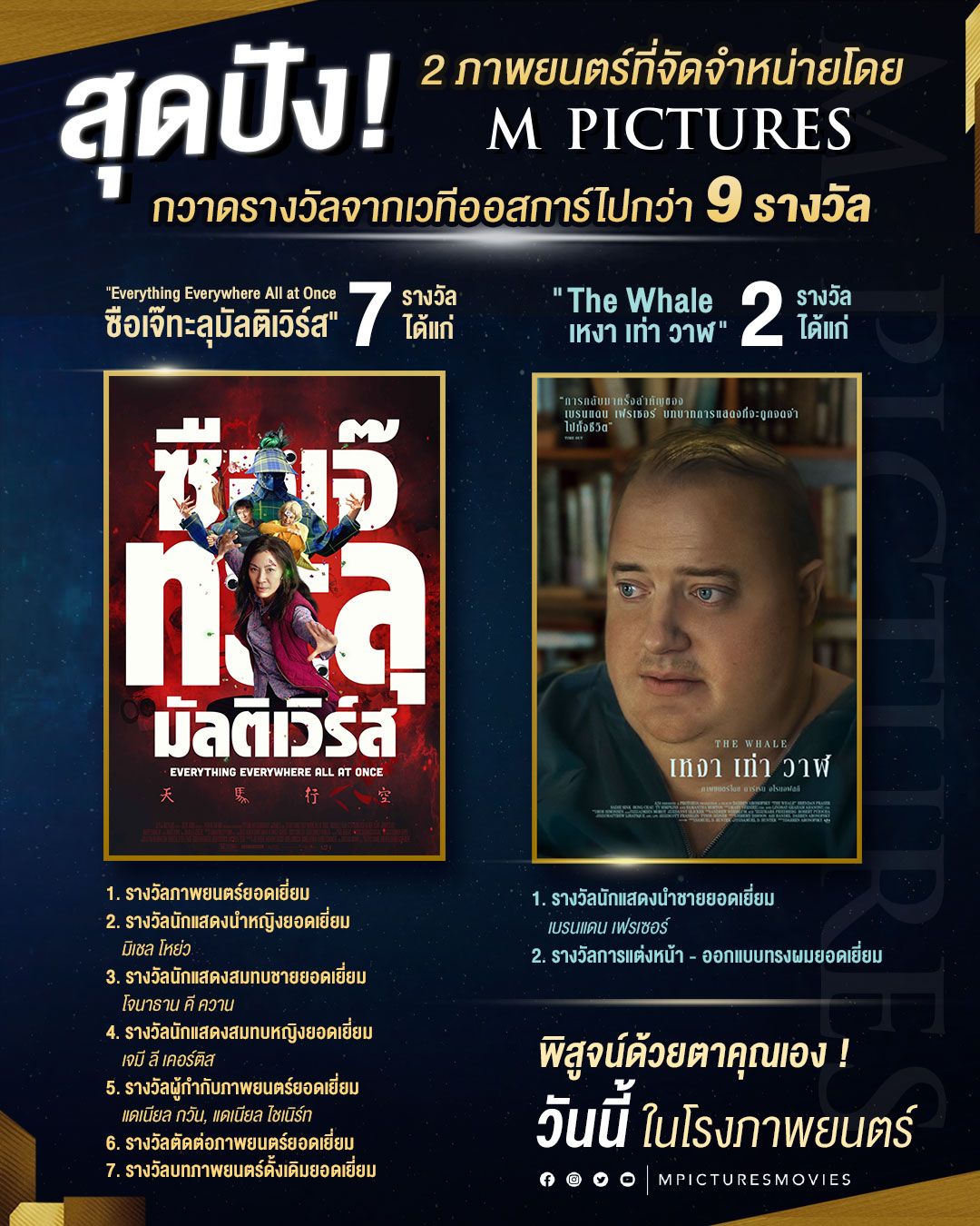 เสร็จสิ้นไปแล้วกับงานประกาศผลรางวัล Academy Awards ครั้งที่ 95 หรือ "ออสการ์ 2023" ที่ปีนี้กลับมาจัดขึ้นอย่างยิ่งขึ้น ณ ดอลบี้ เธียเตอร์ นครลอสแองเจลิส สหรัฐอเมริกาโดย 2 ภาพยนตร์ที่ทาง เอ็ม พิคเจอร์ส เป็นเจ้าของสิทธิ์จัดจำหน่ายที่ประเทศไทย กวาดรางวัลใหญ่กลับบ้านทุกรางวัล ทั้ง Everything "Everywhere All at Once ซือเจ๊ทะลุมัลติเวิร์ส" มงลง กวาดรางวัลใหญ่ไปถึง 7 รางวัล ได้แก่
