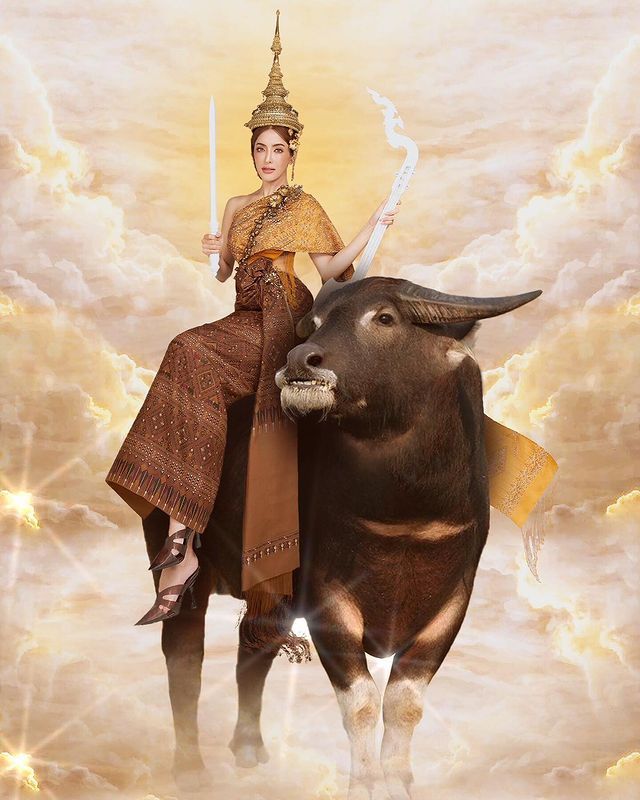 พร้อมเขียนแคปชั่นไว้ว่า "ให้ฉันงามดั่งนางบุษบา ดวงตาสุกใสดั่งจันทร์ฉาย #สงกรานต์ #นางสงกรานต์ #thailand #songkran #khamkoonofficial #pinkysavika"