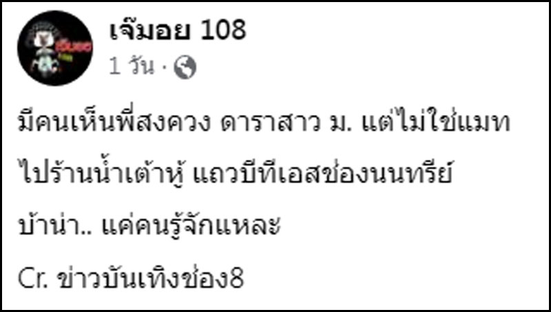 ขณะที่เพจ เจ๊มอย 108 ออกมาโพสต์ข้อความว่า " มีคนเห็นพี่สงควง ดาราสาว ม. แต่ไม่ใช่แมท ไปร้านน้ำเต้าหู้ แถวบีทีเอสช่องนนทรีย์ บ้าน่า.. แค่คนรู้จักแหละ "