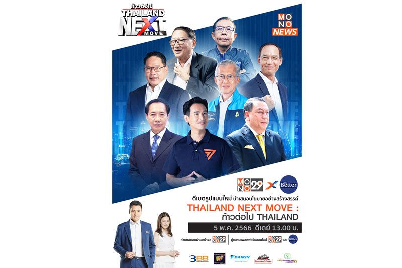 ร้อนระอุดุเดือดเข้มข้นขึ้นเรื่อย ๆสำหรับการเลือกตั้งครั้งสำคัญของประเทศไทย ที่จะมีขึ้นในวันที่ 14 พฤษภาคมนี้ เป็นการชี้ชะตาประเทศไทยในการขึ้นบริหารประเทศของเหล่าพรรคการเมืองต่าง ๆ แต่ก่อนจะถึงวันนั้น ช่องMONO29ร่วมกับสำนักข่าว The Betterจัดรายการพิเศษดีเบตเลือกตั้ง“THAILAND NEXT MOVE : ก้าวต่อไปTHAILAND”โดยถ่ายทอดสดทางช่อง MONO29และทุกช่องทางแพลตฟอร์มออนไลน์ กับเวทีดีเบตรูปแบบใหม่เพื่อทั้ง 8 พรรค นำเสนอนโยบายอย่างสร้างสรรค์ โดยมี 8 พรรคที่เข้ามาร่วมประชันศึกการเมืองครั้งนี้ได้แก่