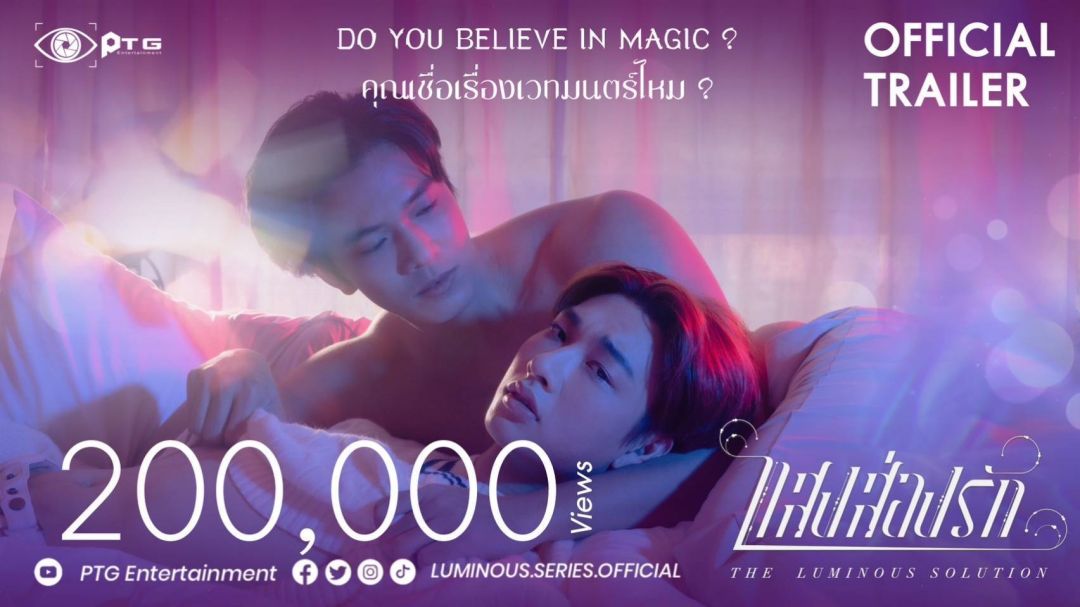 ครั้งนี้ หนุ่มกัน ได้ประกบพระเอกใหม่หน้าคมหุ่นเริดอย่าง มิก-ธีรภัทร โปร่งอรุณ ขอบอกว่า...คู่นี้ถือเป็นคู่พระเอกนายเอกหน้าใหม่ที่เริดมากแม่....เพราะแค่ทริลเลอร์เปิดตัว เหล่า FC ก็ฟินกันแล้วจ้า!!! มาถึงพระเอกนายเอกคู่สองรุ่นเล็ก ภู-ภูดิส วิเศษจิตร ที่เคยฝากผลงานซีรีส์เรื่อง “นิติแมน แฟนวิศวะ” มาแล้ว ล่าสุดมาประกบคู่นักแสดงรุ่นน้อง เบล-รัชตะ คุ้มทรัพย์ คู่นี้ละมุนมาก เป็นอีกหนึ่งคู่วายที่น่าจับตามองทีเดียว “แสงส่องรักThe Luminous Solution” ยังมีนักแสดงมากฝีมืออีกเพียบ ไม่ว่าจะเป็น แพม-แพรพรรณ หิรัญศรีสุนทร, คชา-นนทนันท์ อัญชุลีประดิษฐ์, โดม-วรนาถ รัตนภาส, แบงค์-ธีวรา ปัญญะธารา, แอ๊นท์-วรินดา เนินเพิ่มพิสุทธิ์, เดน่า ชนิษฐา วอน เดอ ลูว และ ตู้เซฟ ทองสะพัก เตรียมพบกับเรื่องราวความรักที่เกิดขึ้น ที่ได้มาจากพรอันแสนวิเศษ แต่ไม่มีพรข้อใด ที่ได้มาโดยไม่มีข้อแลกเปลี่ยน เรื่องความความรักหลายรูปแบบที่เกิดขึ้นจะเป็นยังไง!!! ชม Official Trailer แบบเต็มๆ ได้ที่ https://youtu.be/16yXR-8v6O8 และติมตามซีรีส์ “แสงส่องรัก – Series the Luminous Solution” ออกอากาศทุกวันเสาร์ เวลา 22.30 น. ทางอมรินทร์ทีวี เอชดี ช่อง 34 เริ่มวันเสาร์ที่ 27 พฤษภาคม 2566 เสนอเป็นตอนแรก และอัปเดตทุกความเคลื่อนไหวและรับชมย้อนหลังได้ที่ Youtube : PTG Entertainment เวลา 23.30 น.https://youtube.com/@ptg_entertainment Facebook & Twitter & IG & Tiktok : @Luminous.series.official @ptgentertainment.th
