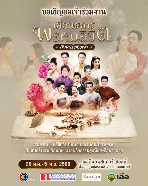 ช่อง 3 ร่วมกับ บริษัทบรอดคาซท์ ไทย เทเลวิชั่น จำกัด ขอพาทุกท่านข้ามกาลเวลาไปกับละครรักโรแมนติกอิงประวัติศาสตร์ “พรหมลิขิต” ชวนทุกคนมา “นุ่งโจง ห่มสไบ”กับงาน “เยือนตลาดพรหมลิขิตสวมจริตออเจ้า” จัดขึ้นระหว่าง วันที่26 ต.ค.-5 พ.ย. 2566 ณ ซีคอนสแควร์ ฮอลล์ ชั้น 1 ศูนย์การค้าซีคอนสแควร์ ถนนศรีนครินทร์