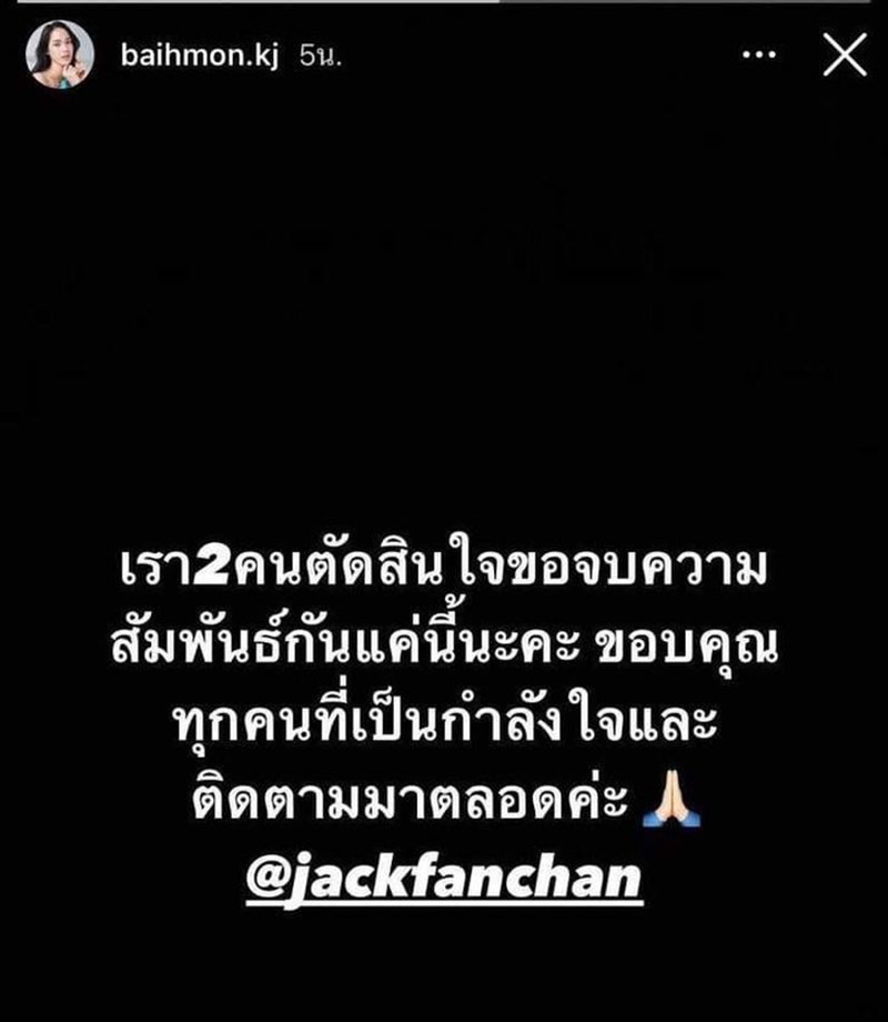 โดยฝ่ายหญิงได้ใช้พื้นที่บนอินสตาแกรมสตอรี่ @baihmon.kj โพสต์ข้อความจอดำระบุเนื้อหาชัดเจน เรื่องสถานะความรักระหว่างเธอกับ แจ็ค แฟนฉัน ให้ทุกฝ่ายเข้าใจตรงกันว่า "เรา 2 คน ตัดสินใจขอจบความสัมพันธ์แค่นี้นะคะ ขอบคุณทุกคนที่เป็นกำลังใจ และติดตามมาตลอดค่ะ @jackfanchan"