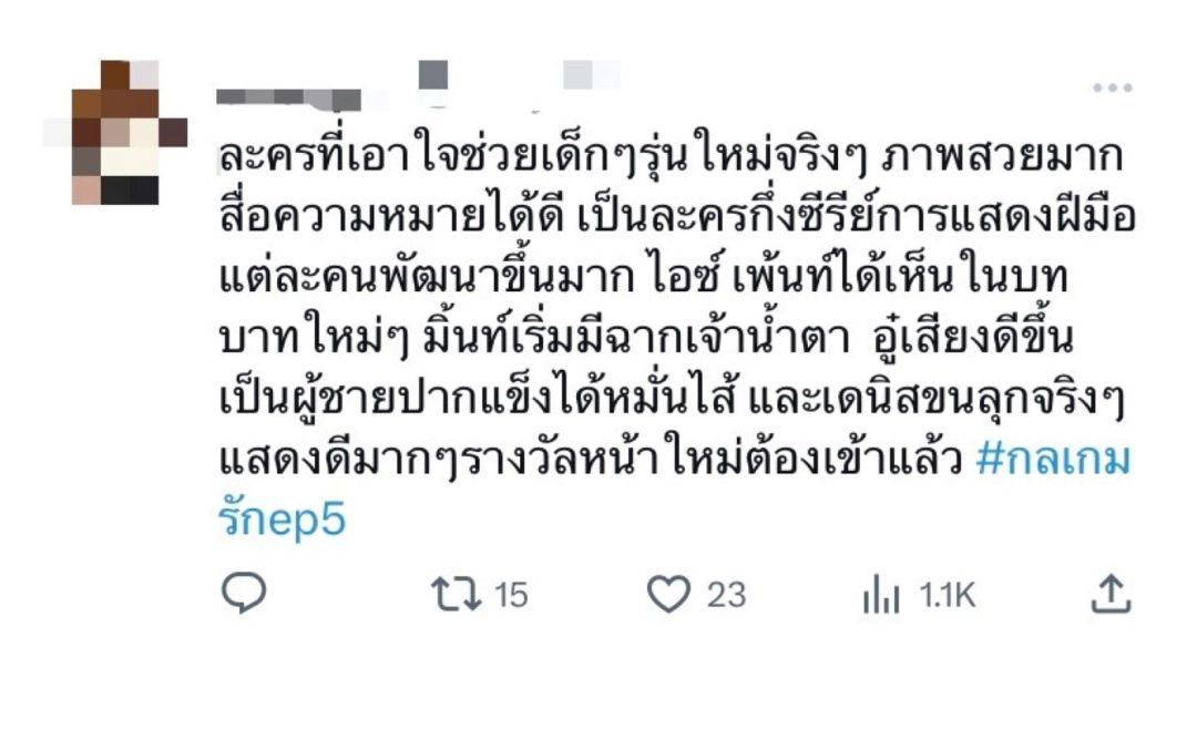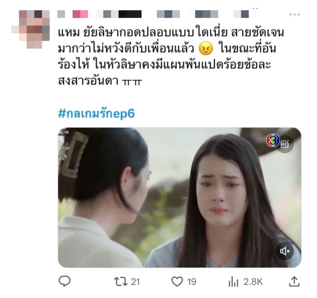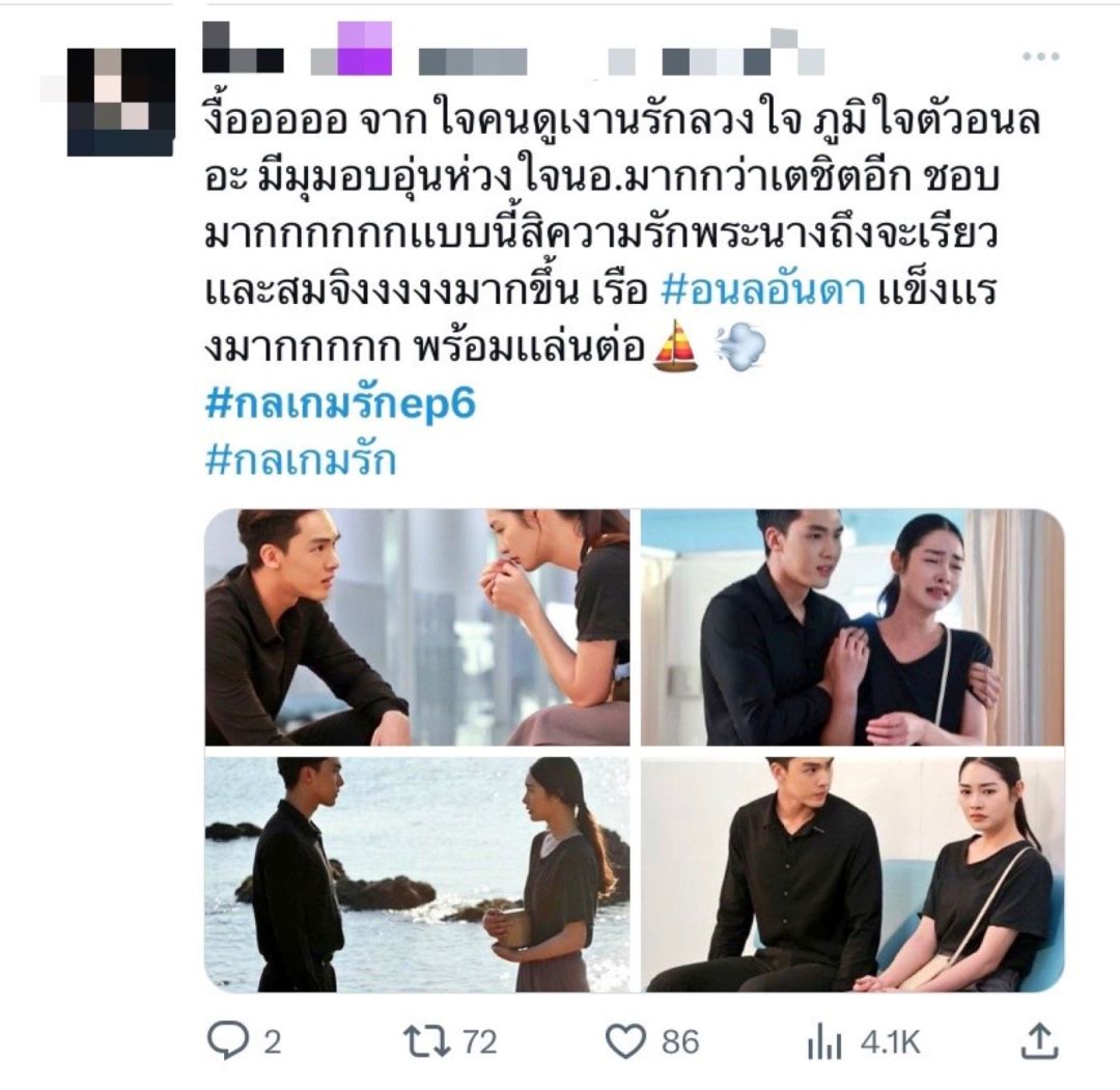 มาถึงกระแสของ “กลเกมรัก” อีพีล่าสุดสาว “มิ้นท์ รัญชน์รวี”เล่นดีอินเนอร์มาเต็ม ยกมงให้เป็นนางเอกเจ้าน้ำตาไปเลยจ้า เพราะทำคนดูรับแรงกระแทกของความรู้สึกเศร้าจนหลั่งน้ำตาสงสารตามตัวละครอันดาอย่างมากที่ต้องสูญเสียคนที่รักไปถึงสองคนแถมมูลนิธิบ้านสายชลบ้านเพียงหลังเดียวของเด็กกำพร้าอย่างอันดายังต้องถูกปิดตัวลงเพราะเหตุไฟไหม้อีก ในระหว่างที่ทำคนดูร้องไห้ปวดตับก็ต้องปรับโหมดมาจิ้น อนล(อู๋ กิตติภณ)กับ อันดาเพราะอนลถึงแม้จะปากไม่ตรงกับใจแต่ก็คอยดูแลอันดาไม่ห่าง และด้วยเคมีความเป็นห่วงเป็นใยทำให้“อู๋-มิ้นท์”ถูกยกเป็นคู่จิ้นคู่ใหม่ของวงการและหลังจากนี้เรื่องราวก็กำลังนำพาทั้งคู่มาพัวพันกันมากขึ้น ต้องมาทำงานร่วมกัน อยู่ใกล้ชิดกันในคอนโดเดียวกัน จนอาจเป็นบ่อเกิดของความรัก เรียกได้ว่าเตรียมรอเสพโมเมนต์จิ้นฟินกระจายของคู่นี้ได้เลย แต่ก็อย่าลืมเผื่อใจเชียร์ภีม (ไอซ์ ภาณุวัฒน์)พ่อหนุ่มสุดละมุนที่พร้อมพิชิตใจอันดาอีกคน เรื่องความฟินความจิ้นก็กำลังจะทำงานต่อเนื่อง ฟากความริษยาอิจฉาก็กำลังทำงานสูงสุดทำ ลลิษา (เดนิส เจลีลชา) เพิ่มเลเวลความร้ายแบบไม่มีขีดจำกัดและพร้อมสวมรอยเป็นลูกเศรษฐีอย่างรมิตา(ไก่ สุปราณี)แทนอันดา เรียกได้ว่าสาว “เดนิส เจลีลชา” ถ่ายทอดบทบาทนี้ได้ปังมาก ยกให้เป็น MVP นางเอกสุดร้ายไปเลย ทำตัวละครลลิษาน่าหยุมหัวสุด ๆ!