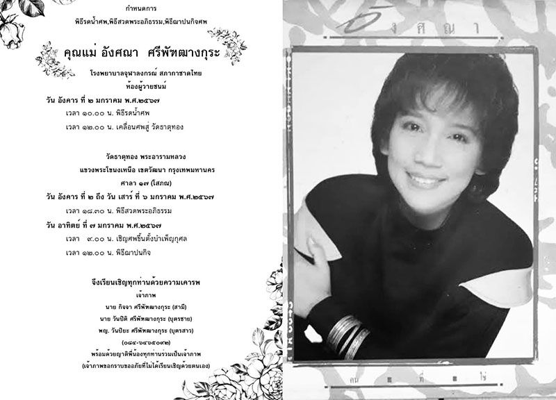 3 มกราคม 2567 อาลัยคนวงการบันเทิง เมื่อเฟสบุ๊ค Jaroensook Limbanchongkit Pone แจ้งข่าวเศร้า อดีตนักร้องดัง 'อังศณา ช้างเศวต' จากไปอย่างสงบเมื่อวันที่ 1 มกราคม ที่ผ่านมา