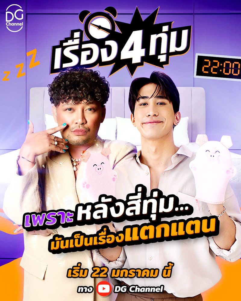 ปิดท้ายด้วย รายการ เรื่อง 4 ทุ่ม รายการวาไรตี้อีกหนึ่งรายการที่น่าจับตามองพร้อมสโลแกน บุกถึงถิ่น คนดัง ทุกวงการ! พร้อมไปล้วง ไปดู ไปแซะ ว่า หลัง 4 ทุ่ม เขาทำอะไรกันดำเนินรายการจากตัวแม่“พี่เติร์ก-อมรศักดิ์ เดชห้วยไผ่” ตัวแม่ไทยแท้ แต่สปีชอิงลิชสุดเริ่ด ควงพระเอกหนุ่มหล่อ “ไกด์-กันตพล ชมภูพันธ์”ฉีกทุกกฎการคุย เพราะทั้งคู่จะพาบุกไปล้วงลึกตามส่อง พร้อมแซะว่าหลัง 4 ทุ่ม เหล่าคนดังเขาทำอะไรกัน ติดตามกันได้ใน วันจันทร์ที่ 22 มกราคมนี้ ตอบโจทย์คนนอนดึก4 ทุ่มตรง (ออกอากาศทุกวันจันทร์ เวลา 22.00 น. ทางยูทูบ DG channel) และนี่คือทั้งหมดของปรากฏการณ์รายการทาง DG channel ภายใต้คอนเซ็ปต์ EVERYTHING’SON YOU ที่จะมาเสิร์ฟ ออริจินัลคอนเทนต์3 รายการ 3 รูปแบบ 3 สไตล์ อย่างรายการตัวตึง, รายการร้ายได้อีก และรายการ เรื่อง 4 ทุ่ม ให้แฟนๆ ได้เปิดประสบการณ์ความบันเทิงรูปแบบใหม่ ที่ดูได้ทุกที่ แฟนๆสามารถรับชมพร้อมติดตามได้ที่ช่องทางยูทูบ DG channel และ RSDG ทุกช่องทางของโซเชียล