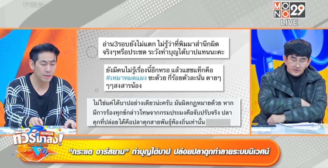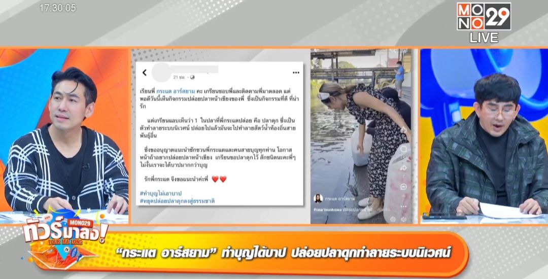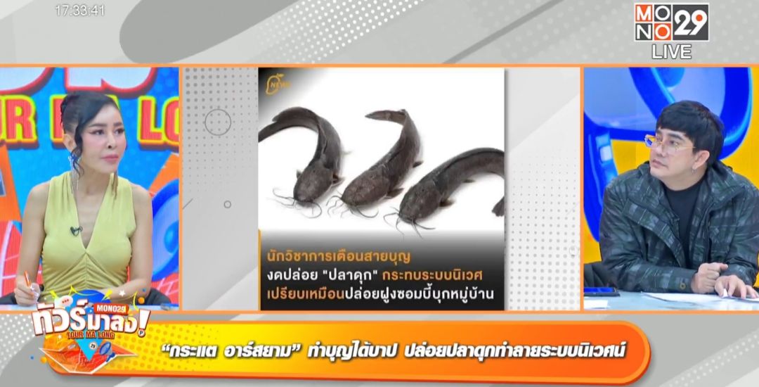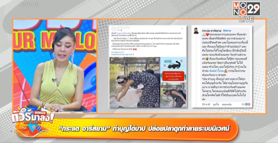 อีกด้านจะสร้างบุญแต่ทัวร์มาลงว่าจะได้บาปแทน สำหรับศิลปินสาว กระแต อาร์สยาม หลังโพสต์คลิปไปปล่อยปลาดุกหน้าเขียงที่ซื้อจากตลาดพร้อมแฮชแทค#เหมาหมดแผงจากนั้นเพจดังเพจหนึ่งก็ได้แคปรูปจากคลิปไปโพสต์เตือนสาว กระแตว่ากิจกรรมปล่อยปลาเป็นสิ่งที่ดี แต่ปลาดุกซึ่งเป็นตัวทำลายระบบนิเวศน์ปล่อยไปแล้วมันจะไปทำลายสัตว์น้ำท้องถิ่นสายพันธุ์อื่น ไม่รอช้าสาว กระแส โพสต์โต้กลับยอมรับว่าไม่รู้ ขอบคุณการแนะนำถ้ารู้ก่อนจะไม่ทำ พร้อมแฮชแทค #แต่ทำไปละ “กรรมใครกรรมมันละกัน ใครพลอยยินดีก็ปิติไปด้วยกันส่วนใครคิดไม่ดีก็ให้เป็นอกุศลในใจไปค่ะ”เท่านั้นแหละรถทัวร์ทำงานอย่างไว เกิดเสียงวิพากย์วิจารณ์ถึงการฟาดกลับทำไมในเมื่อตนทำผิด พิธีกร เป็กกี้ แชร์ความรู้ว่าการปล่อยปลาดุกก็เหมือนปล่อยฝูงซอมบี้เข้าไปในหมู่คน “มันจะกินปลาเล็กปลาน้อย กินยับเพราะว่าปลาดุกถ้าไม่ใช่สายพันธุ์ธรรมชาติมันจะกินแบบแหลกลาญ เพราะเป็นปลาดุกเลี้ยงมีพฤติกรรมที่เห็นทุกอย่างเป็นอาหารทั้งหมด”การปล่อยปลาดุก 1 ตันทำให้สูญเสียสัตว์น้ำท้องถิ่นประมาณ 1.8 ล้านชีวิตต่อปี อยากทำบุญไปทำบุญอย่างอื่นพิธีกรเพชรจ้า แซวหนักแนะวิธีแก้ไขให้น้อง กระแต ลงไปจับปลาดุกกลับมา“ปล่อยไป 5 ตัวก็ลงไปจับมาทั้ง 5 ตัวจบเรื่อง”แหม๋ ๆ ว่าไปนู้น