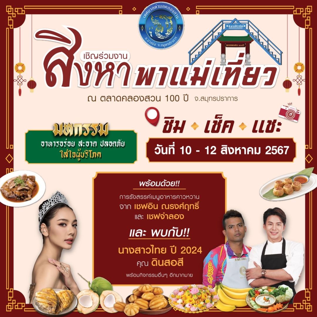 ตลาดคลองสวน 100 ปี จ.สมุทรปราการ ร่วมกับ เทศบาลตำบลคลองสวน อำเภอบางบ่อ จังหวัดสมุทรปราการ ขอเชิญทุกท่านร่วมงาน “สิงหาพาแม่เที่ยว” ชิม เช็ค แชะ ณ ตลาดคลองสวน 100 ปี จ.สมุทรปราการ ภายใต้งาน มหกรรม อาหารอร่อย สะอาด ปลอดภัย ใส่ใจผู้บริโภค ร่วมเดินชมนิทรรศการ และร่วมชิมอาหาร จากการออกร้านอาหารชวนชิม โดยมีการนำเอาอาหารคาว - หวาน ในท้องถิ่นมาจัดบูธชวนชิม กว่า ๑๕ อย่าง ด้วยกัน และภายในงานจะมีการออกร้านค้าจำหน่ายผลิตภัณฑ์ สินค้า อาหาร ของที่ระลึก ของดีของเด่นจากชุมชนตำบลคลองสวน อำเภอบางบ่อ จังหวัดสมุทรปราการ กิจกรรมถ่ายรูปและเช็คอิน เพื่อรับของรางวัล รวมทั้งกิจกรรมพิเศษชมการรังสรรค์อาหารจากวัตถุดิบชั้นเลิศจากชุมชนตำบลคลองสวน พร้อมทั้ง ร่วมชมและชิม กิจกรรมการรังสรรค์ เมนูอาหาร เมนูเด็ด โดยเน้นการใช้วัตถุดิบในท้องถิ่น จาก เชฟอิน ณรงค์ฤทธิ์ เชฟดังในโลกโซเชียล และ เชฟจำลอง จากรายการมาสเตอร์เชฟ นอกจากนี้ภายในงานยังได้พบกับนางสาวไทยประจำปี 2567 คุณดินสอสี และกิจกรรมอื่นๆอีกมากมาย โดยงานจะจัดตั้งแต่วันที่ 10-12 สิงหาคมนี้ ตั้งแต่เวลา 08.00 – 17.00 น. ณ บริเวณตลาดคลองสวน 100 ปี อำเภอบางบ่อ จังหวัดสมุทรปราการ แล้วพบกันนะครับ