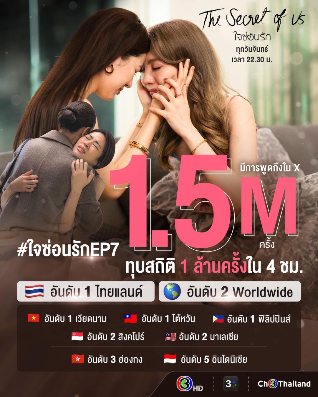 ทวีคูณความแรงทะลุเพดานจริง ๆสำหรับ “ใจซ่อนรัก” The Secret of Us ทางช่อง 3ไม่ว่าจะออกอากาศมากี่ตอนก็ฟาดเรียบทุกกระแสยืนหนึ่งอย่างต่อเนื่องกับความนิยมของ 2 นางเอกสาวสวย“หลิงหลิง คอง” และ “ออม กรณ์นภัส”ที่ถูกพูดถึงและครองใจแฟน ๆ ไปทั่วโลก สร้างปรากฏการณ์ฟีเวอร์ไปทุกพื้นที่ทั้งในจอและนอกจอเรียกว่าเป็นทอล์กออฟเดอะทาวน์ที่สุดของปีกันเลยทีเดียว