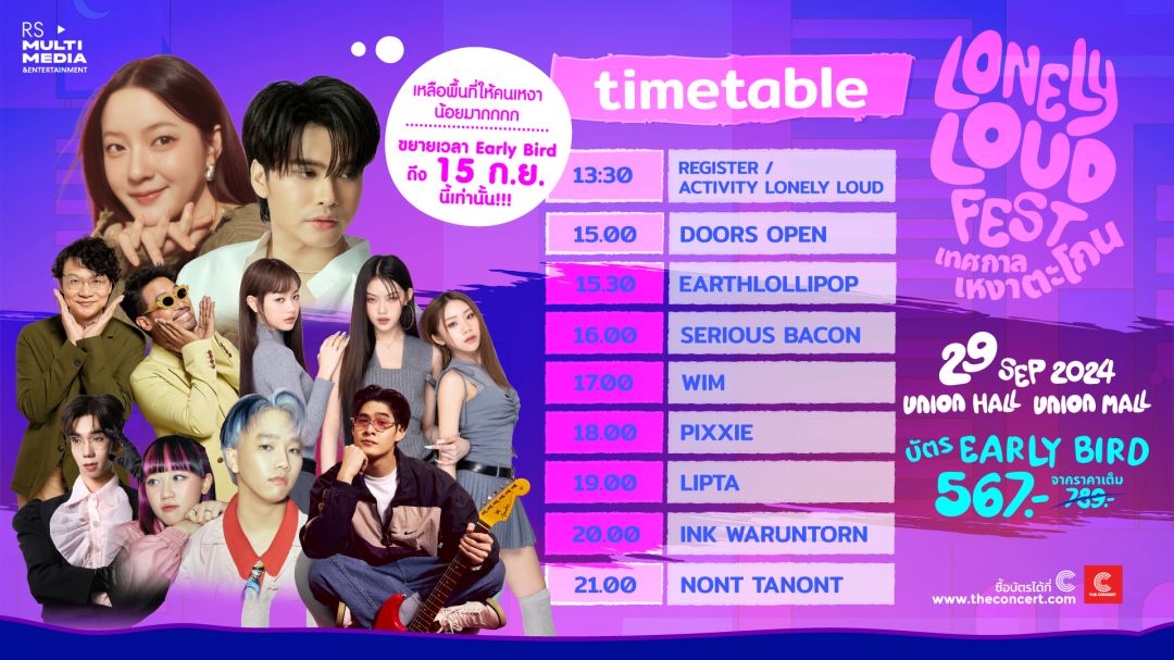 คนเหงาเตรียมปล่อยจอยความสนุก ฟินให้สุดในทุกด้อม จัดเต็มนานกว่า 6 ชั่วโมง กับงาน “LONELY LOUD FEST เทศกาลเหงาตะโกน” จัดโดย อาร์เอส มัลติเอ็กซ์ ในเครือ อาร์เอส กรุ๊ป งานเฟสที่รวมพลคนเหงาแต่ไม่เศร้า ยกทัพศิลปินตัวท๊อป สุดป๊อบ ของยุคนี้ นำทัพโดยนนท์ ธนนท์, อิ้งค์ วรันธร, PIXXIE, LIPTA, SERIOUS BACONและ WIMหรือ กานต์ กษิดิ์เดช หงส์ลดารมภ์ และยังมีแขกรับเชิญพิเศษสุดเซอร์ไพรส์ EARTH LOLLIPOPหรือ เอิร์ท ภูริ สระทองเถื่อน จากค่าย FASHในเครือ RS Musicมาร่วมขึ้นโชว์ในงานนี้ด้วย สำหรับคนเหงาที่มีแพลนมาปล่อยความเหงากับศิลปินคนไหน จงเตรียมร่างกายไว้ให้พร้อม แล้วมาเต้น โยก ตะโกนร้องกันให้สุดเสียง กับพวกเค้าเหล่านี้ได้ ใน วันอาทิตย์ที่ 29 กันยายนนี้ ณ UNION HALL ศูนย์การค้า UNION MALLตารางศิลปินด้อมที่รัก ขึ้นโชว์เวลาไหนบ้างไปดูกัน