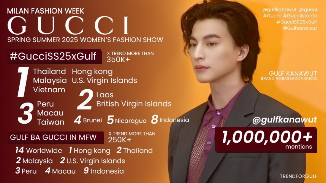 นอกจากนั้น หนุ่มกลัฟยังกวาดความปังทางโลกออนไลน์ด้วยการนำ #GucciSS25XGulf ทาง X (ทวิตเตอร์) ครองบัลลังก์อันดับ 1 ทั้งไทย มาเลเซีย เวียดนาม ฮ่องกง และ หมู่เกาะเวอร์จินของสหรัฐอเมริกา รวมไปถึง #GulfBAGucciINMilan ขึ้นอันดับหนึ่งในฮ่องกง, อันดับสองในไทย มาเลเซีย, หมู่เกาะเวอร์จินของสหรัฐอเมริกา, อันดับสามที่เปรู , อันดับสี่ที่มาเก๊า และอันดับที่เก้าในอินโดนิเซีย เรียกว่าสมฐานะแบรนด์แอมบาสเดอร์เป็นที่สุด