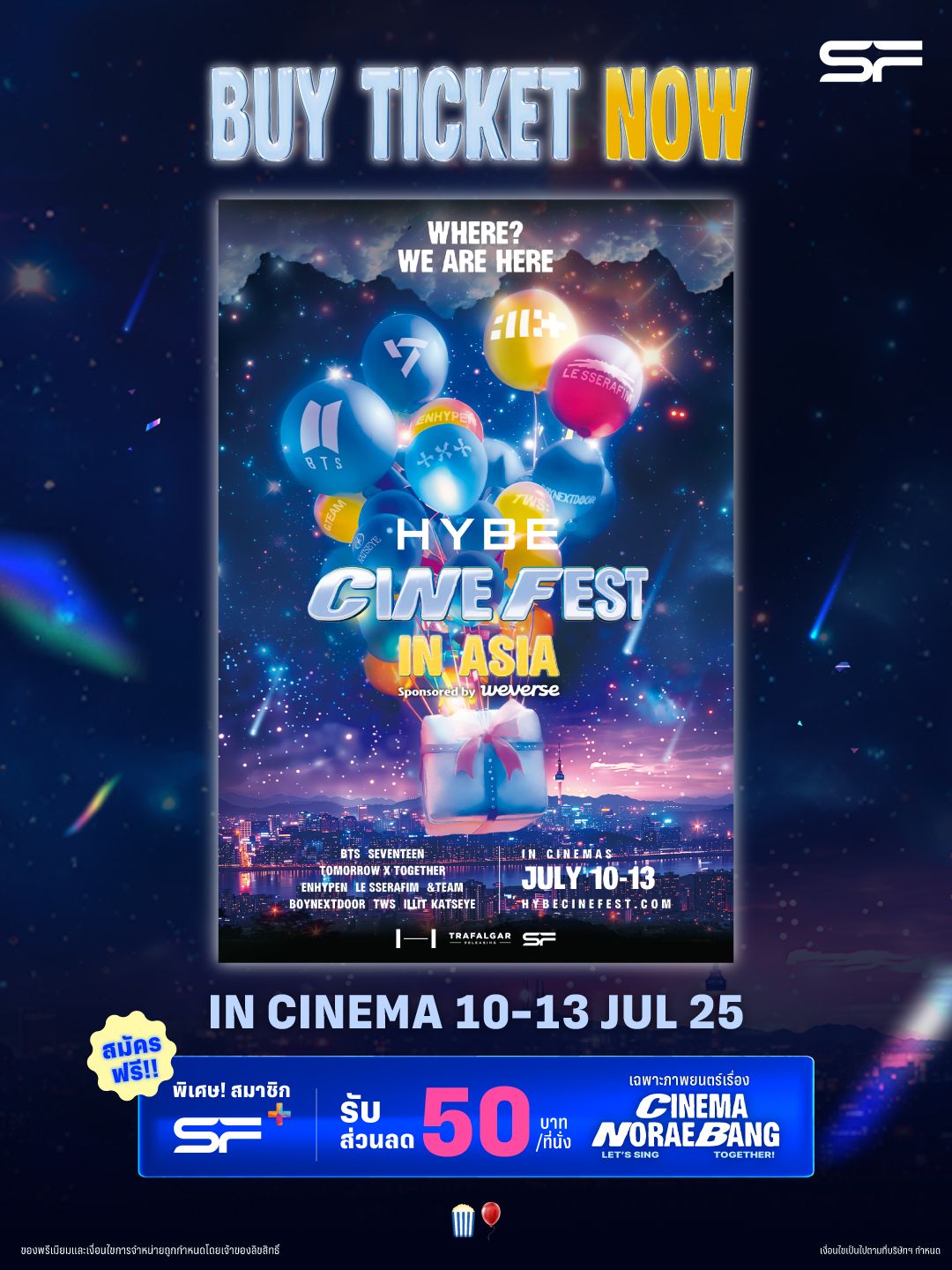 โรงภาพยนตร์ในเครือ เอส เอฟ ร่วมกับ HYBE และ Trafalgar เตรียมระเบิดความมันส์ครั้งแรกในประเทศไทยและในเอเชียกับ “HYBE CINE FEST IN ASIA” พบกับภาพยนตร์คอนเสิร์ต 5 เรื่อง จากศิลปิน เค-ป๊อป ระดับโลกภายใต้สังกัด HYBE อาทิ BTS, SEVENTEEN, TOMORROW X TOGETHER, ENHYPEN และอีกมากมาย รับชมพร้อมกันบนจอยักษ์ภาพคมชัดระดับ 4K ที่โรงภาพยนตร์ในเครือ เอส เอฟ 30 สาขาทั่วประเทศ พร้อมพบกับ HYBE CINE FEST EXHIBITION บูธจำหน่ายสินค้าที่ระลึก จุดถ่ายภาพ และกิจกรรมเซอร์ไพรส์อีกมากมาย ที่โรงภาพยนตร์เอส เอฟ เวิลด์ ซีเนม่า ศูนย์การค้าเซ็นทรัลเวิลด์ ระหว่างวันที่ 10 – 13 กรกฎาคม 2568