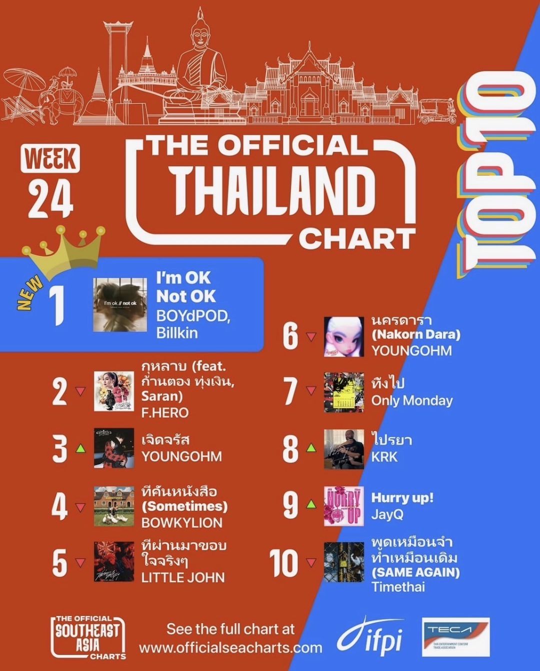 โค่นแชมป์เก่าอย่าง“กุหลาบ”ไปแล้วสัปดาห์นี้ สำหรับเพลงกระแสแรงไม่หยุด! “I’m ok // not ok” ซิงเกิลล่าสุดจาก ป๊อด- ธนชัย อุชชิน จับมือรุ่นน้องสุดฮอต Billkin - บิวกิ้น พุฒิพงศ์อัสสรัตนกุลจากอัลบั้ม"BOYdPOD//OST.SideB"ปล่อยแค่ไม่ถึง10วันก็สร้างแรงสั่นสะเทือนในวงการเพลงไทยด้วยการขึ้นแท่นอันดับ1บน“TheOfficial ThailandChart”โค่นแชมป์เก่าเพลง“กุหลาบ”ที่ครองบัลลังก์มายาวนานถึง16สัปดาห์ลงได้อย่างสวยงาม!เบื้องหลังความสำเร็จนี้มาจากบทเพลงสุดละเมียดที่เขียนโดยบอยโกสิยพงษ์ ถ่ายทอดอารมณ์
