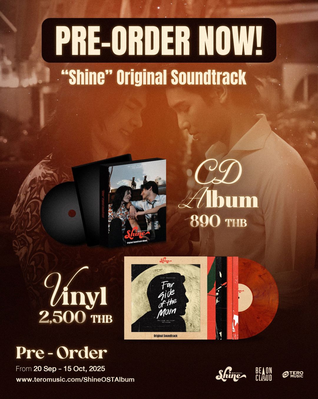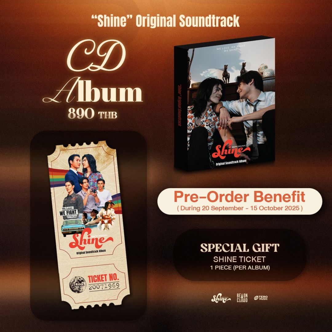 หลังจากกระแสความฮอตของซีรีส์เกย์ Shine แรงจนขึ้นแท่นเป็นซีรีย์เด็ด เพลงดี จนมีเสียงเรียกร้องจากแฟนๆให้มีการทำอัลบั้ม OST. Shine ล่าสุดแฟนๆ ถึงกับกรี๊ดลั่นโซเชียล! เมื่อค่าย Tero Music และ Be On Cloud ทนกระแสเรียกร้องจากแฟนๆ ไม่ไหว นอกจากเนื้อเรื่องสุดเข้มข้น และนักแสดงแม่เหล็กที่ทำเอาแฟนๆ อินกันทั่วบ้านทั่วเมืองแล้ว ล่าสุดกระแสความแรงยังมาสู่วงการเพลงเต็มๆ จนต้องเปิดพรีออเดอร์ “Shine” Original Soundtrack Album ทั้งCD และ Vinyl อัลบั้มเพลงประกอบสุดยิ่งใหญ่ที่หลายคนบอกตรงกันว่า “นี่แหละ OST. แห่งปี!” เป็นการรวบรวม 12 เพลงสุดเข้มข้น ถ่ายทอดทั้งความรัก ความฝัน และความหมายของเสรีภาพในยุค 60–70 เรียกได้ว่าฟังแล้วเหมือนย้อนเวลาไปกรุงเทพฯ ปี 2512 กันเลยทีเดียว!