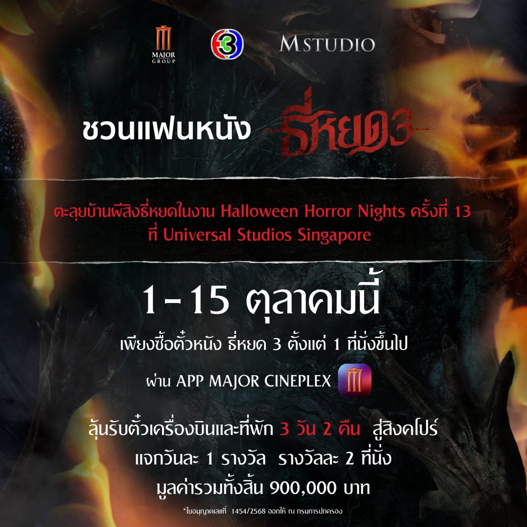 เพียงซื้อตั๋วชมภาพยนตร์ ธี่หยด 3 ตั้งแต่ 1 ที่นั่งขึ้นไป ผ่าน APP Major Cineplex ระหว่างวันที่ 1–15 ตุลาคมนี้ ก็มีสิทธิ์ลุ้นตั๋วเครื่องบินไป–กลับ พร้อมที่พัก 3 วัน 2 คืน สำหรับ 2 ที่นั่ง แจกทุกวัน วันละ 1 รางวัล รวมมูลค่ากว่า 900,000 บาทงานนี้ไม่เพียงแต่ได้พิสูจน์ความกล้ากับตำนานความสยองแบบไทยบนจอใหญ่ แต่ยังได้ร่วมประสบการณ์จริงกับบ้านผีสิงธี่หยด ที่ยกไปหลอนถึงสิงคโปร์ เรียกได้ว่าเป็นโอกาสที่แฟนหนังและคอหนังสยองขวัญไม่ควรพลาด! รีบซื้อตั๋ว “ธี่หยด 3” ได้แล้ววันนี้ แล้วมาลุ้นบินไปผวาพร้อมกัน!