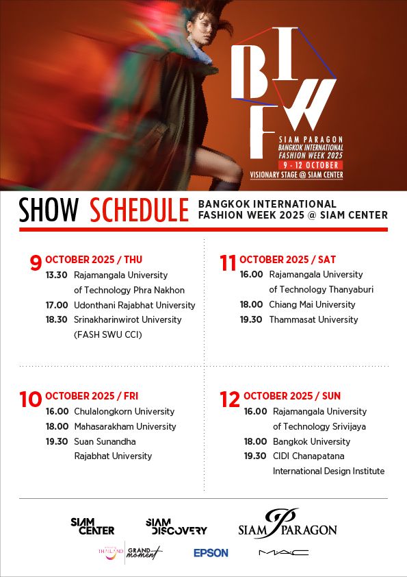 งาน Bangkok International Fashion Week 2025 จัดขึ้นระหว่างวันที่ 9 – 12 ตุลาคม 2568 ณ Visionary Stage ชั้น G สยามเซ็นเตอร์ และ วันที่ 16-19 ณ สยามพารากอน พร้อมพบกับผลงานสร้างสรรค์ของยังก์ดีไซเนอร์โดยวางจำหน่ายที่ Absolute Siam Store ชั้น 1 และบน ONESIAM SuperApp