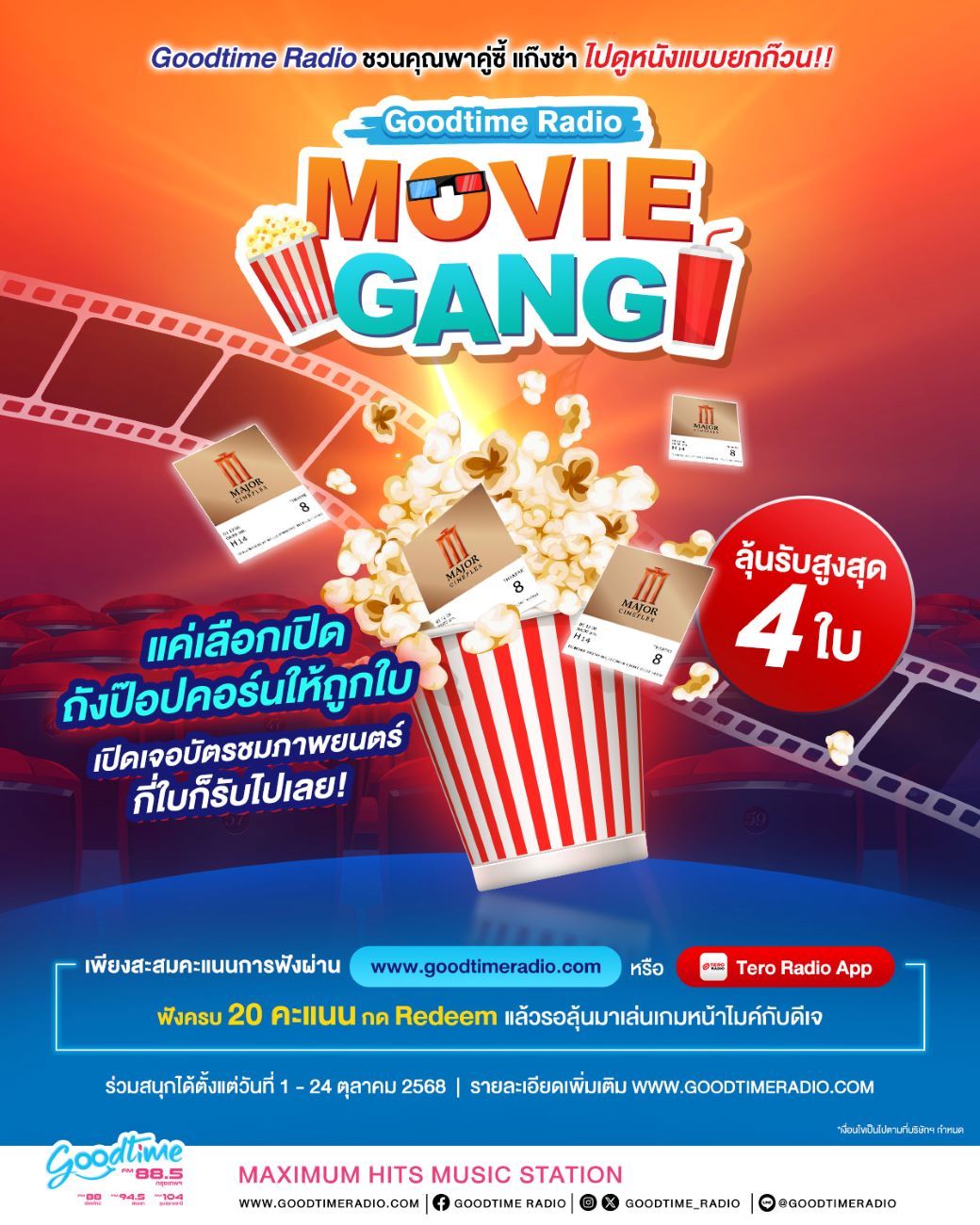 "Goodtime Radio จัดกิจกรรมตามใจแฟนรายการสุดๆ เลยครับ กลับมาอีกครั้งตามคำเรียกร้อง สำหรับ "Goodtime Radio Movie Gang" ที่ให้ผู้ฟังได้ร่วมสนุกลุ้นรับบัตรชมภาพยนตร์ ครั้งนี้เราให้ลุ้นกันสูงสุดรางวัลละ 4 ใบ ให้คุณได้ไปดูหนังกับเพื่อนๆ แบบยกแก๊งเลยครับวิธีร่วมสนุกก็ง่ายๆ เหมือนเดิมเลยครับ แค่สะสมคะแนนการฟัง Goodtime Radio ผ่านทาง www.teroradio.com หรือ Tero Radio App แล้วใช้ 20 คะแนนมา Redeem แลกสิทธิ์ลุ้นมารวมสนุกเปิดถังป๊อปคอร์นหน้าไมค์กับดีเจ สามารถ Redeem แลกสิทธิ์ลุ้นได้ไม่จำกัดจำนวนครั้งเลยนะครับ ถังป๊อปคอร์นของเราก็มีบัตรชมภาพยนตร์ให้ลุ้นกันทั้งแบบ 2 ใบ 3 ใบ และ 4 ใบ สะสมคะแนนการฟังและ Redeem ร่วมสนุกได้ถึงวันที่ 24 ตุลาคมนี้เท่านั้นนะครับ"ติดตามฟังรายละเอียดเพิ่มเติมและร่วมสนุกกับกิจกรรม Goodtime Radio Movie Gang ได้ตลอดทุกช่วงดีเจ หรือทาง www.teroradio.com และ Tero Radio App