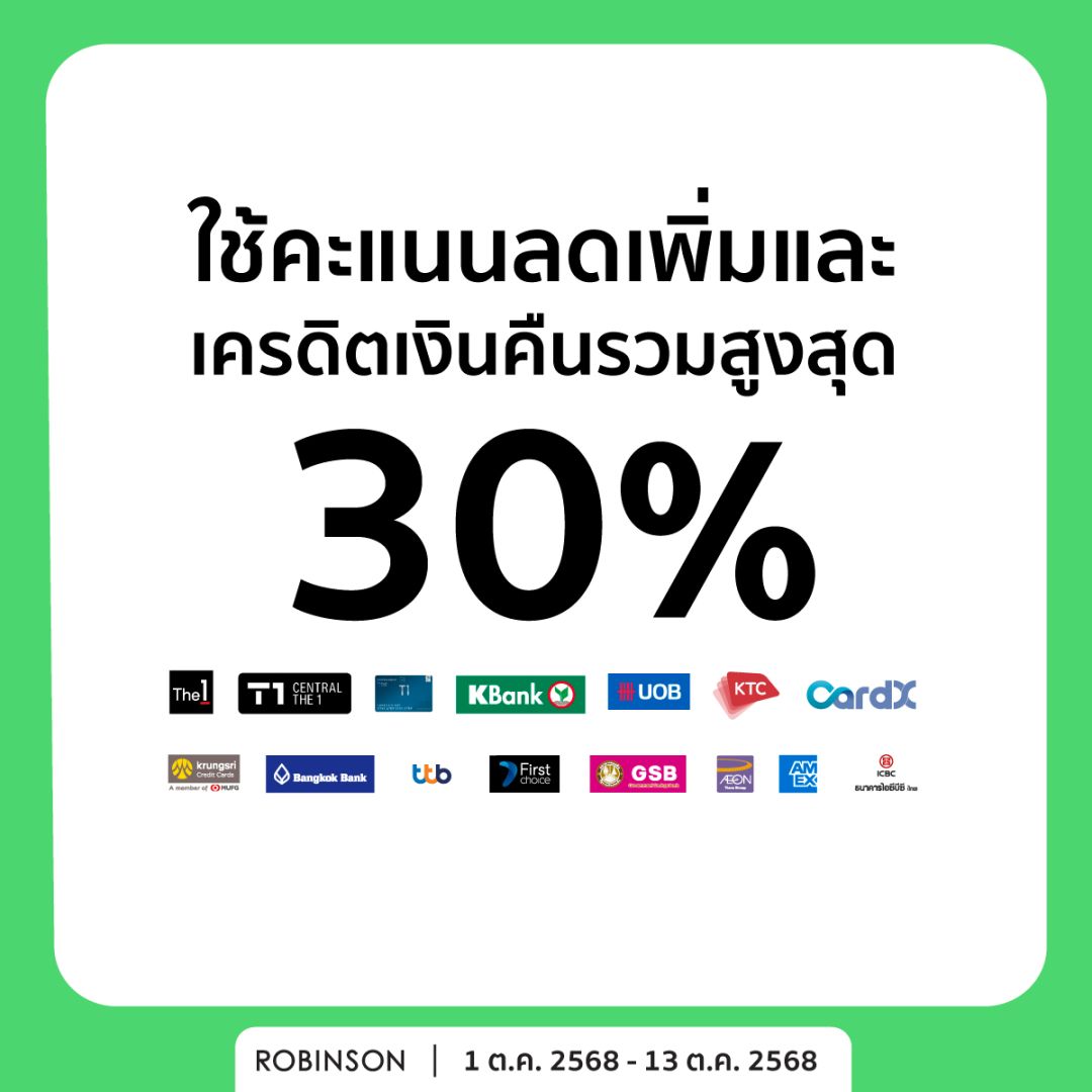 โปรสุดปังที่สายช้อปห้ามพลาด! แบรนด์แฟชั่น ไลฟ์สไตล์ บิวตี้ และแบรนด์ไอจีสุดฮอตถึง 40 แบรนด์ สินค้าเฉพาะรุ่น ลดสูงสุดถึง 70% รับคูปองและเครดิตเงินคืนรวมสูงสุดถึง 7,500 บาท (เมื่อช้อปตามเงื่อนไขที่กำหนดผ่านบัตรเครดิตที่ร่วมรายการ) แลกรับไอติมนกโรบิ้น ฟรี! เมื่อช้อปครบ 500 บาทขึ้นไป / ใบเสร็จ (จำนวนจำกัด)