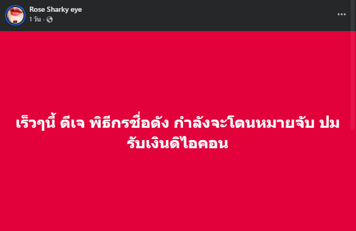 5 ตุลาคม 2568 กลายเป็นมหากาพย์ที่ยังไม่มีทีท่าจะสิ้นสุด สำหรับกรณี “ดิ ไอคอน (The Icon)” ที่สร้างกระแสวิพากษ์วิจารณ์อย่างต่อเนื่องในโลกออนไลน์ ล่าสุด เพจชื่อดัง Rose Sharky Eye ได้ออกมาโพสต์อัปเดตสถานการณ์ โดยระบุว่า “เร็วๆ นี้ ดีเจ พิธีกรชื่อดัง กำลังจะโดนหมายจับ ปมรับเงินดิไอคอน”