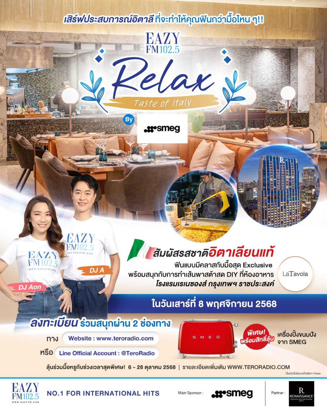 " Eazy Relax : Taste of Italy ครั้งนี้รับรองว่าอิ่มท้องและสนุกสุดๆ แน่นอนค่ะ เพราะนอกจากอ้อนจะพา 15 คู่ผู้โชคดีไปทานอาหารอร่อยๆ ที่ห้องอาหารอิตาเลียน La Tavola โรงแรมเรเนซองส์ กรุงเทพฯ ราชประสงค์แล้ว เรายังมีกิจกรรมสนุกๆ อย่างการทำพาสต้าเส้นสด ให้คุณและคนพิเศษได้ทดลองทำร่วมกันอีกด้วยค่ะ ส่วนเมนูอาหารอิตาเลียนที่คุณจะได้ทานในวันนั้น บอกเลยว่าอร่อยถูกใจแน่นอนค่ะ มีให้เลือกทานทั้งเมนูซิกเนเจอร์ อย่าง มอสซาเรลล่าโนดินี เสิร์ฟคู่มะเขือเทศเฮียร์ลูมหมัก เห็ดพอร์โทเบลโลหมัก และเซมิ-เคียวร์บีฟโรลล์กับโฟมกรานาพาดาโน รวมถึงอาหารอิตาเลียน อาทิ พิซซ่าเนเปิลส์ต้นตำรับ พาสต้าหลากหลาย รวมถึงเมนูอื่นๆ เช่น พอร์เชตต้า, ไพร์มริบอารอสโต้ อัลลากลิโอ เอ โรสมารีโน และเมนูของหวานอีกมากมายเลยค่ะใครอยากไปมีวันพักผ่อนสบายๆ กับ Eazy Relax : Taste of Italy ในวันเสาร์ที่ 8 พฤศจิกายนนี้ ไม่ยากเลยค่ะ แค่ลงทะเบียน พิมพ์ชื่อ - นามสกุล และเบอร์โทรศัพท์ของคุณ พร้อมแนบรูปคู่ของคุณกับคนพิเศษที่อยากพาไปทำกิจกรรมร่วมกัน ผ่านทาง www.teroradio.com และ LINE Official Account: @TeroRadio แล้วรอลุ้นเป็นผู้โชคดีมาพูดคุยหน้าไมค์กับดีเจและไปร่วมกิจกรรม Eazy Relax : Taste of Italy ด้วยกันค่ะ ลงทะเบียนร่วมสนุกได้จนถึงวันที่ 28 ตุลาคมนี้เท่านั้นนะคะ"ติดตามรายละเอียดเพิ่มเติมและร่วมสนุกกับกิจกรรม Eazy Relax : Taste of Italy ได้ตลอดทุกช่วงดีเจ ทาง Eazy FM และ Tero Radio App