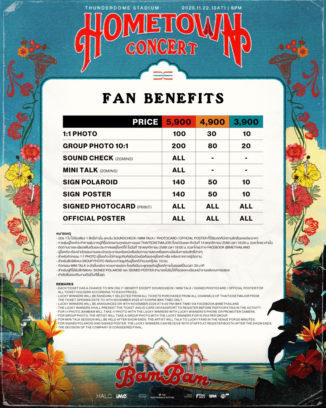 ความปังของ “แบมแบม” ไม่มีคำว่าถอย มีแต่พุ่งขึ้นเรื่อยๆ และในคอนเสิร์ตใหญ่ครั้งนี้เจ้าตัวก็ทุ่มเทสุดหัวใจ เพื่อมอบโชว์ที่ดีที่สุดให้กับแฟนๆ ในบ้านเกิดที่เขารักที่สุด “HOMETOWN” ที่มีความทรงจำ ความผูกพัน และผู้คนที่รักแบมแบมอย่างล้นหลาม! แฟนคลับห้ามพลาดมาเป็นส่วนหนึ่งของ “2025 BamBam HOMETOWN Concert in Bangkok” เพราะอะไรที่คุณคิดว่าอาจจะไม่มี อาจจะมีมากกว่าที่คิด! อะไรที่คิดว่าจะไม่ได้เห็น เตรียมเห็นแบบจัดเต็ม! และเซอร์ไพรส์ที่ไม่คาดคิด อาจจะเกิดขึ้นเฉพาะที่นี่..ที่เดียวเท่านั้น!!