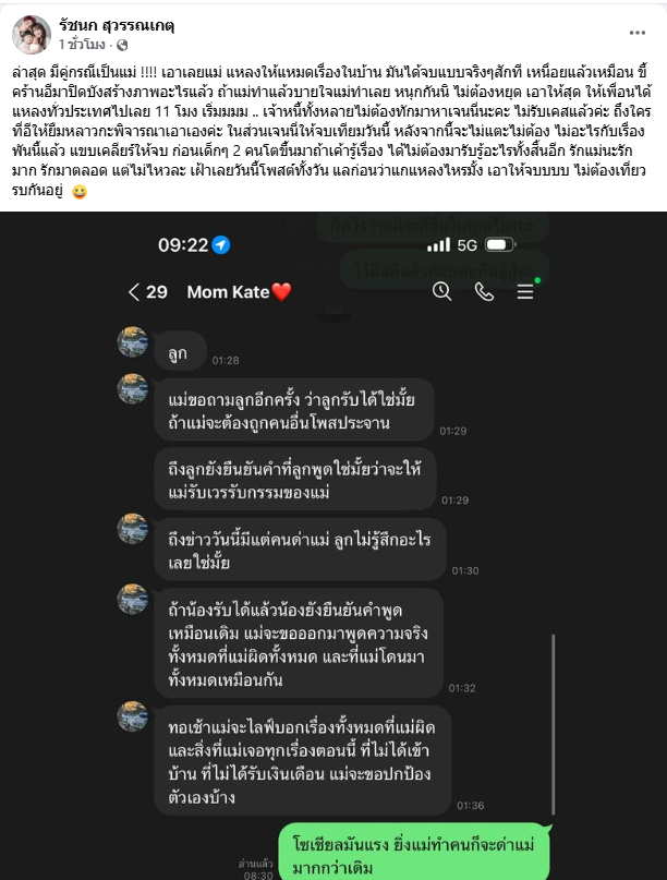 ต้องบอกว่ากลายเป็นดราม่าอีกระลอกใหญ่ เมื่อนักร้องลูกทุ่งลูก 2 อย่าง เจนนี่ ได้หมดถ้าสดชื่น หรือ รัชนก สุวรรณเกตุ ได้ออกมาโพสต์ข้อความโดยเป็นแชทสนทนาระหว่างเธอกับคุณแม่เกตุ พร้อมอธิบายผ่านเฟซบุ๊กส่วนตัวว่า