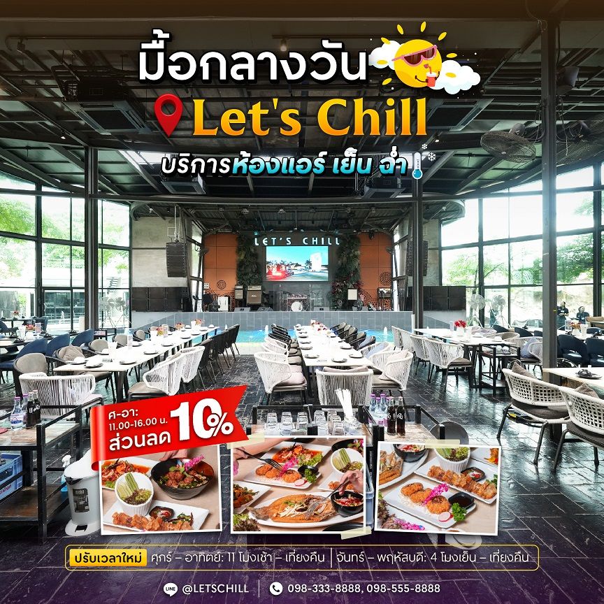 Let’s Chill New Cool เปิดให้บริการทุกวัน จ.-พฤ. 16.00 น. - 24.00 น. และ ศ.-อา. 11.00 น. - 24.00 น. ร้านตั้งอยู่ ถนนชัยพฤกษ์ ปากเกร็ดนนทบุรี หรือมาตามโลเคชั่นที่ปักหมุดด้านล่างนี้ได้เลยhttps://maps.app.goo.gl/7Wx7zbGGXYBbe82x5?g_st=ipcสนใจสำรองที่นั่งได้ที่ Tel: 098-555-8888 หรือ 098-333-8888 หรือสอบถามเพิ่มเติมได้ที่ Facebook Fanpage https://www.facebook.com/letschill.mr?mibextid=LQQJ4d