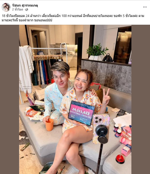 เจนนี่ โพสต์ผ่านเฟซบุ๊กที่มี บูม หมูทะ เพื่อนสนิทเคียงข้างช่วยขายสินค้า ว่า " 18 ชั่วโมงปิดยอด 24 ล้านกว่า เดี๋ยวเริ่มต่ออีก 100 กว่าแบรนด์ อีกทีตอนบ่ายโมงนะคะ ขอพัก 5 ชั่วโมงค่ะ ตามมานะคะวันนี้ ของฉ่ำมาก ขอนอนแปปป "