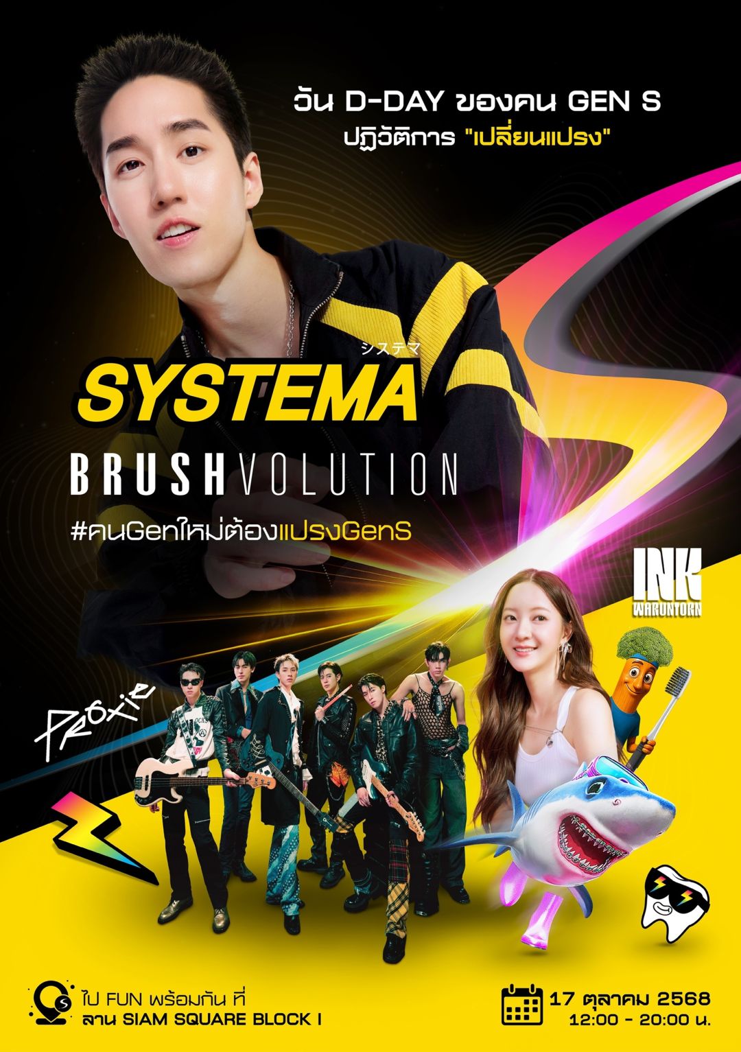SYSTEMA ชวนมาปฏิวัติการ “เปลี่ยนแปรง”สุดยิ่งใหญ่ ที่งาน “SYSTEMA BRUSHVOLUTION” ครั้งแรกกับการเปิดตัวแปรงสีฟัน Gen S ลุคใหม่ทั้งซีรีส์ รวม 12 รุ่น พบกับพรีเซนเตอร์สุดหล่อ “ต่อ-ธนภพ” และมินิคอนเสิร์ตแบบจัดเต็มกว่า 2 ชั่วโมงจาก “อิ๊งค์-วรันธร” และวง “PROXIE” พร้อมเล่นเกมสนุกๆ ลุ้นรับ Exclusive SYSTEMA Box Set พร้อมกิจกรรมมาร่วมค้นหาแปรงสีฟันที่แมทซ์กับตัวคุณ ในวันศุกร์ที่ 17 ตุลาคม 2568 นี้ ตั้งแต่เวลา 12.00–20.00 น. ณ ลานสยามสแควร์ บล็อกไอ อย่าลืมจัดเต็มธีมชุดสีดำ-เหลือง-ซิลเวอร์ แล้วมาเป็น #คนGenใหม่ต้องแปรงGenS ไปด้วยกัน