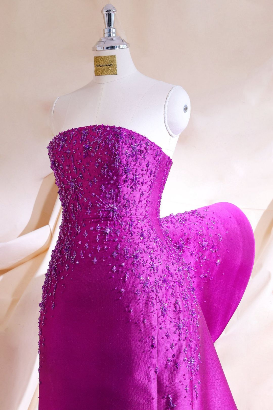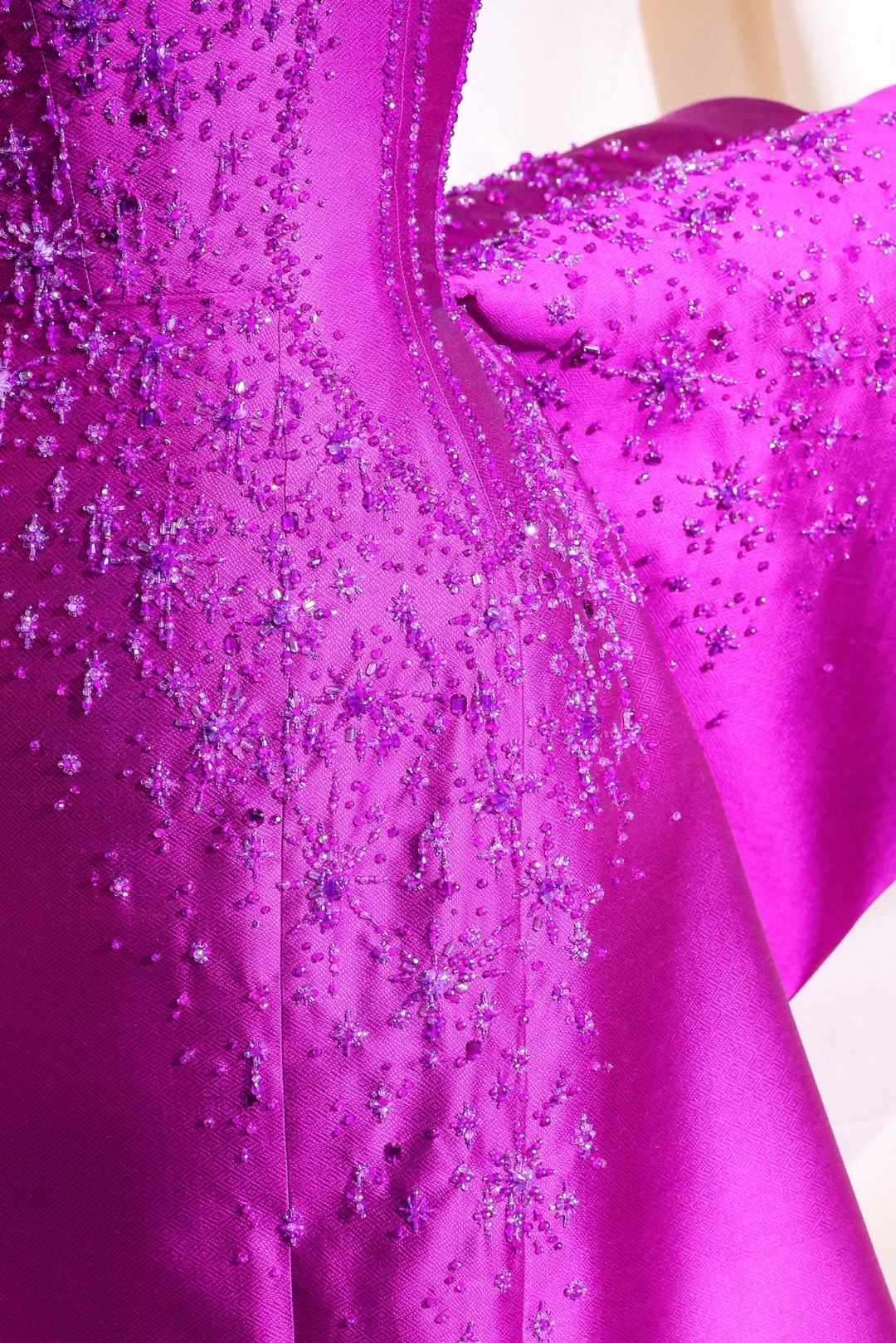 โดยนำผลงาน archive ชุดฟินาเล่สุดอลังจากแฟชั่นโชว์ Spring/Summer 2025 มาเป็นต้นแบบ และมารายห์เจาะจงเลือกใช้ผ้าไหมไทย เพื่อเป็นการยกย่องงานฝีมือของชาติไทย ในโทนสีม่วงชมพู ที่เธอโปรดปราน เนรมิตขึ้นผ่านงานตัดเย็บเสื้อผ้าชั้นสูง ใช้ผ้าไหมลายลูกแก้ว สีม่วงมาเจนต้า (สีเกสรชมพู่มะเหมี่ยว) อันหรูหรา จากมูลนิธิส่งเสริมศิลปาชีพฯ พร้อมดีเทลช่วงหลัง ขึ้นโครงจีบผ้าเป็นช่อดอกไม้โดดเด่นยามเคลื่อนไหว