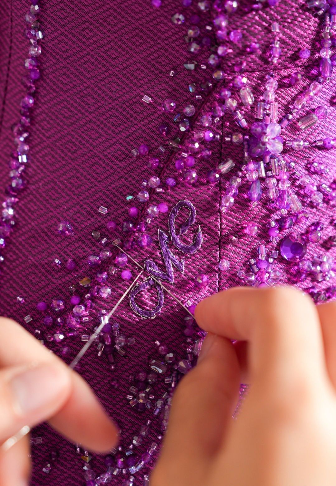 งานปักบนชุดที่เปล่งประกายแสงรับสปอตไลท์บนเวที คืองานปักโดยช่างฝีมือจาก SIRIVANNAVARI Atelier and Academy สตูดิโองานปักชั้นสูงของแบรนด์ ที่ถ่ายทอดแรงบันดาลใจจาก “ดอกรัก” ดอกไม้ร้อยพวงมาลัย ผ่านคริสตัล เลื่อม และแท่งแก้วนับหลายพันชิ้น ปักเรียงต่อกันเป็นลายเส้นสามมิติ บรรจงปักนานนับร้อยชั่วโมง