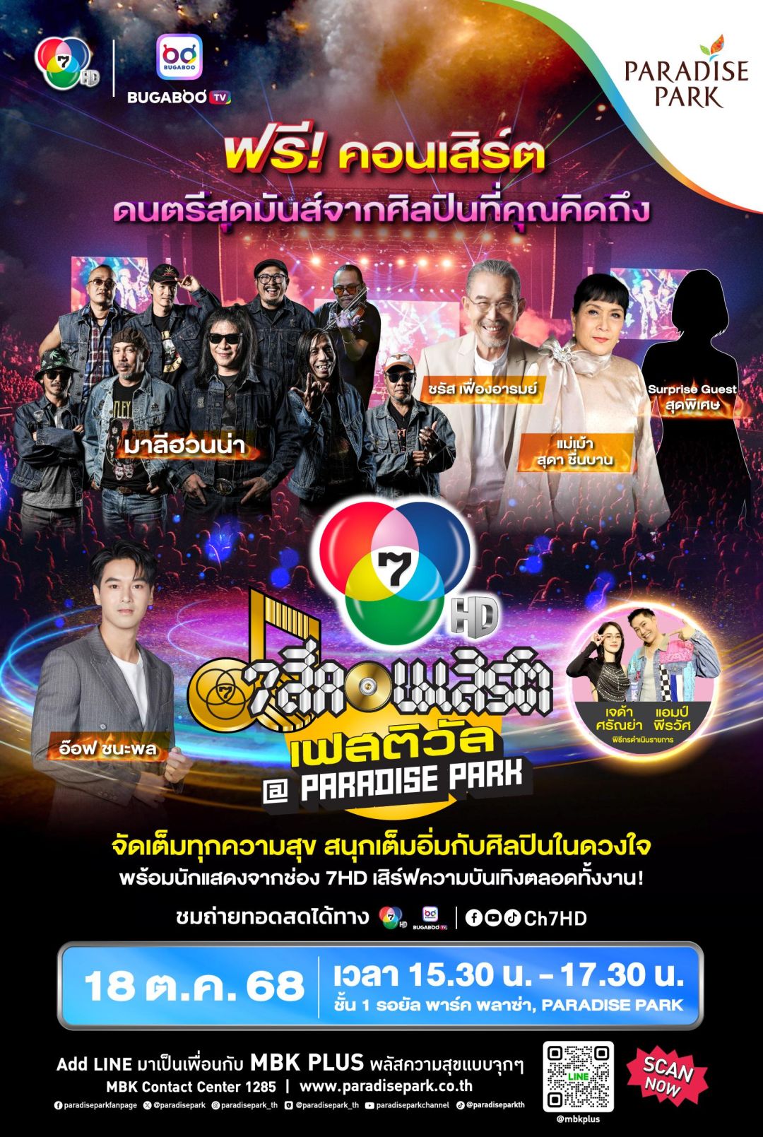 แม้คอนเสิร์ตจะจบลง แต่เสียงเพลงจากศิลปินในดวงใจยังคงดังก้องอยู่ในความทรงจำของทุกคน ทั้งความอิ่มเอม ความสุข และรอยยิ้มที่เกิดขึ้นบนเวทีแห่งนี้ ยังคงอบอวลอยู่ในหัวใจของแฟนเพลงทุกช่วงวัย และมีอีกหลายคนที่ตั้งตารอวันที่จะได้พบกับศิลปินคนโปรดของเขาอีกครั้ง พาราไดซ์ พาร์ค พร้อมแล้ว ที่จะพาทุกคนมาสร้างความทรงจำบทใหม่กับ 7 สีคอนเสิร์ต เฟสติวัล@ Paradise Park ครั้งต่อไป ที่พิเศษยิ่งกว่าเดิม! พบกับสนุกกับวงดนตรีเพื่อชีวิตระดับตำนานอย่าง “วงมาลีฮวนน่า” ที่มาพร้อม “แม่เม้า สุดา ชื่นบาน” ศิลปินแห่งชาติ “ชรัส เฟื่องอารมย์” นักร้องเสียงนุ่ม ยุค80's และ Surprise Guest สุดพิเศษ ร่วมด้วย “อ๊อฟ ชนะพล” นักแสดงจากช่อง 7HD ที่จะมาเวทีสร้างความสุขแบบจัดเต็ม ในวันเสาร์ที่ 18 ตุลาคม ตั้งแต่เวลา 15.30 น. – 17.30 น. ณ ลานรอยัล พาร์ค พลาซ่า ศูนย์การค้าพาราไดซ์ พาร์ค บอกเลยว่างานนี้ห้ามพลาด!