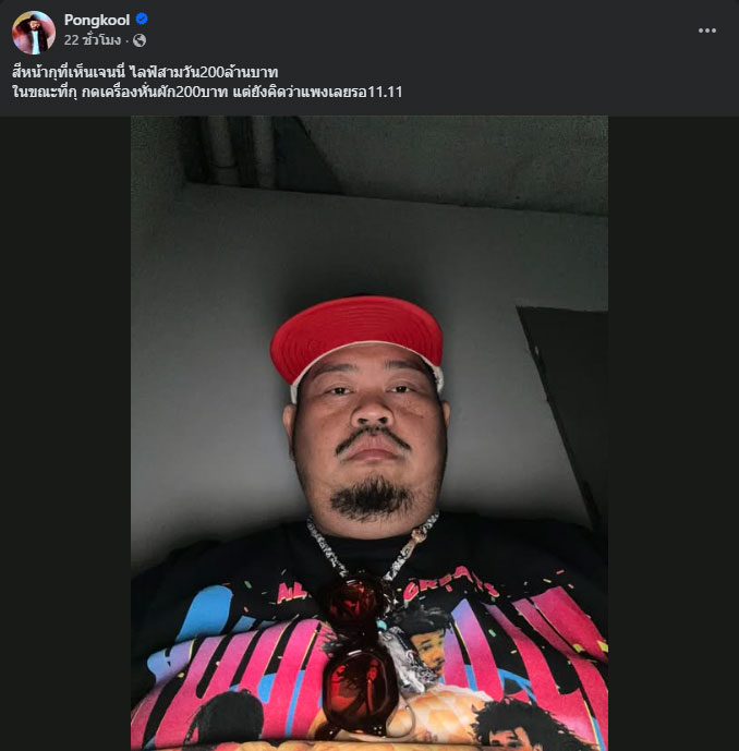 โดยหนุ่มป๊อบได้โพสต์ภาพตัวเองพร้อมแคปชันสุดจี๊ดที่เรียกเสียงหัวเราะจากชาวเน็ตว่า “สีหน้ากูก็เห็นเจนนี่ ไลฟ์สามวัน 200 ล้านบาท ในขณะที่กู กดเครื่องหั่นผัก 200 บาท แต่ยังคิดว่าแพงเลยรอ 11.11”