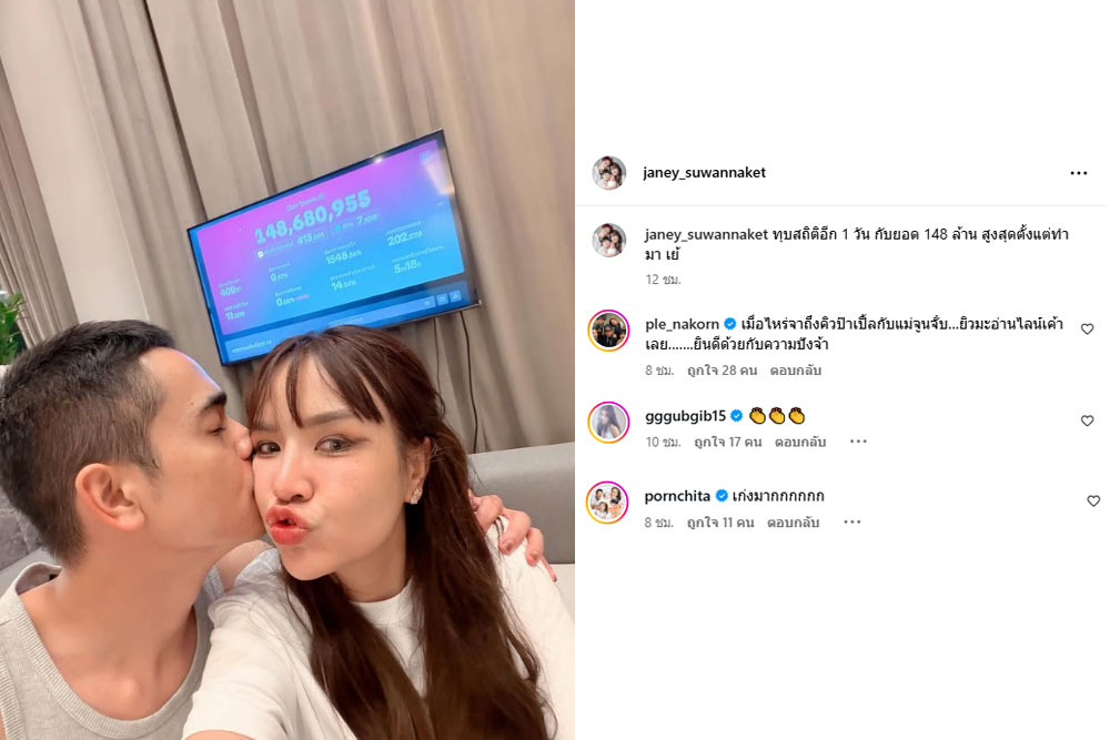 ล่าสุด 'เจนนี่ ได้หมดถ้าสดชื่น' ได้ออกมาโพสต์โซเชียลส่วนตัว"@janey_suwannaket" พร้อมกับสามีโชว์ยอดไลฟ์ 1 วัน พร้อมแคปชั่น "ทุบสถิติอีก 1 วัน กับยอด 148 ล้าน สูงสุดตั้งแต่ทำมา เย้"