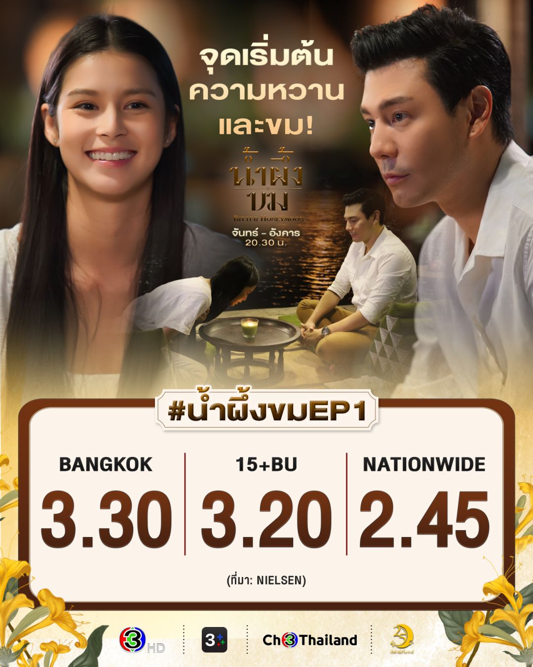 เปิดฉาก #น้ำผึ้งขมEP1 ด้วยเรตติ้งสุดปัง โดยกลุ่มผู้ชมกรุงเทพฯ คว้าไป 3.3 ทางด้านกลุ่มผู้ชมอายุ 15 ปี ขึ้นไป หรือ กลุ่ม 15 BU+ (Bangkok and Urban) ได้ไป 3.2 และเรตติ้งทั่วประเทศอยู่ที่ 2.45 เป็นการเปิดตัวที่แรงเกินต้านทำเอาสองพระนางโดม-ยิหวา ยิ้มปลื้มกับผลตอบรับที่ดีในครั้งนี้!