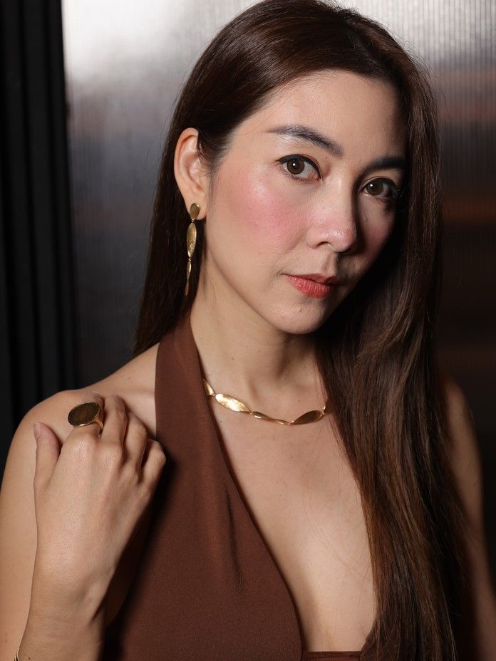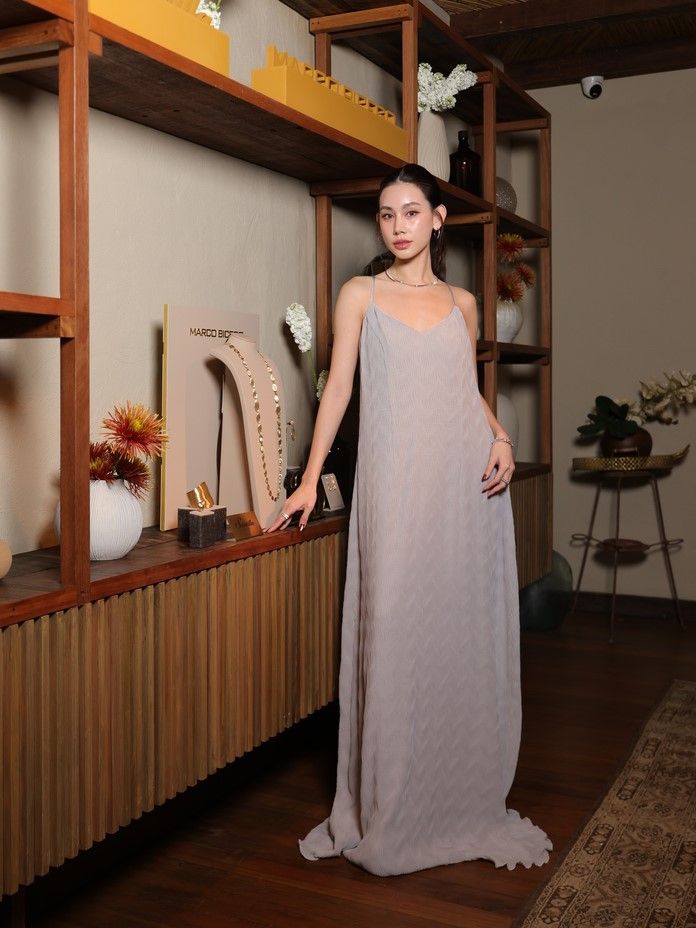 ที่จะเลือก กำไล ต่างหู และแหวน สี Yellow Gold จากคอลเลกชัน Lunaria มาคอมพลีทลุคสุดปัง ปิดท้ายด้วยสาวสายแฟอย่าง ดาว-พิมพ์ทอง มาในแมกซี่เดรสยาว โทนเทาอ่อน เพิ่มลูกเล่นด้วยจิวเวลรี่ครบเซ็ต ไม่ว่าจะเป็น สร้อยคอ กำไล