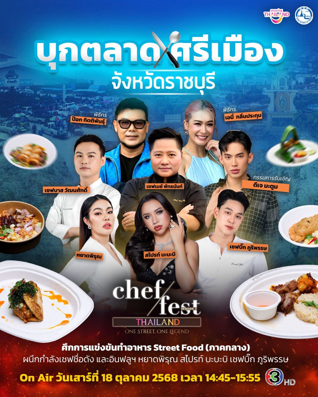 ครัวระอุ “Chef Fest Thailand Season 3 : One Street,One Legend” ขยับเข้าสู่ครึ่งทางของซีซั่น พร้อมเปิดฉากเดือดกลาง ตลาดศรีเมือง จ.ราชบุรี เมื่อเหล่า 10 เชฟตัวจริง ต้อง “Re-image เมนูภาคกลาง” ให้กลายเป็นสตรีทฟู้ดสไตล์ครีเอทีฟ ภายในเวลาแค่ 2 ชั่วโมง! ในสนามดวลฝีมือการทำอาหารที่ไม่ใช่แค่ “ปรุงให้อร่อย” แต่ต้อง “ขายได้จริง” ท่ามกลางกองทัพลูกค้ากลางตลาดสดที่จะเป็นหนึ่งในผู้ร่วมตัดสินอนาคตว่าใครได้อยู่ต่อ ใครต้องกลับบ้านไปก่อน นำทีมความสนุกโดย 2 พิธีกร ป๊อก-กิตติพันธ์ ปันตะกั่ว และ เอมี่ กลิ่นประทุม กับโจทย์สุดหิน โดยใช้วัตถุดิบจริงผักผลไม้ปลอดสารพิษจากตลาดศรีเมืองด้วยงบประมาณเพียง 1,000 บาทเท่านั้น! ที่สำคัญต้องมีส่วนผสมพิเศษตามเงื่อนไขที่รายการกำหนด ผ่าน “เกมจิตวิทยา” ที่เดิมพันด้วยศักดิ์ศรีของทีม ร่วมด้วย Special Guest Influencer ระดับ 2 ตัวแม่ ตัวมัม หยาดพิรุณ&สไปรท์ บะบะบิ และ เชฟบิ๊ก-ภูริพรรษ ใจวีระวัฒนากุล เชฟหล่อกร้าวใจ ทำหน้าที่ “ตัวช่วย” หน่วยซัพพอร์ตร่วมวางแผนตั้งแต่เรื่องวัตถุดิบแรกจนถึงเสิร์ฟคำสุดท้าย เพื่ออัปสกิลความว้าวให้ทุกจานมีทั้งสตอรี่และซิกเนเจอร์ที่เป็นเอกลักษณ์เฉพาะตัว พร้อมเอาชนะใจ 3 กรรมการสุดโหด เชฟเมย์-พัทธนันท์ ธงทอง(National Coach, Thailand Culinary Academy), เชฟบาส-วัฒนศักดิ์ ช่างเก็บ(Executive Chef, Hungry Nerd), ดีเจมะตูม-เตชินท์ พลอยเพชร สายกินฝีปากแซ่บ ภายใต้เงื่อนไขเวลาที่บีบคั้น 1 จานจะตัดสินอนาคตของ 10 เชฟ เมนูของทีมไหนจะรอดหรือร่วง? พลาดไม่ได้ใน “Chef Fest Thailand Season 3 : One Street,One Legend” วันเสาร์ที่ 18 ตุลาคม 2568 เวลา 14.55 น. ทางช่อง 3
